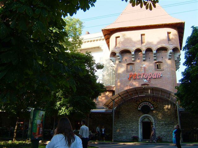 スヴァボディ通りを南に進んでいくと通りの西側一体に夏になると通り沿いいっぱいにパラソルの下にテーブルが並べられています。ここはウクライナ料理を出すレストランですが、レストラン塔もこれまた一風変わっており中世の見張り塔をそのまま利用したレストランです。夏になると音楽の生演奏なんかもあったりしてとても雰囲気の良いレストランです。