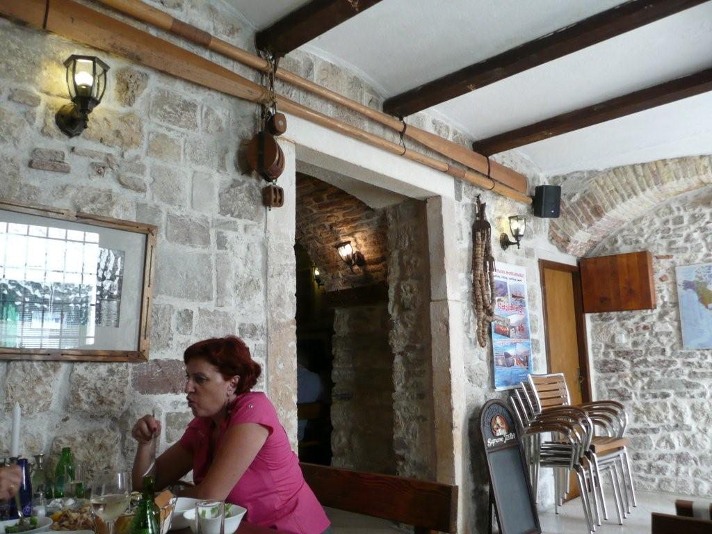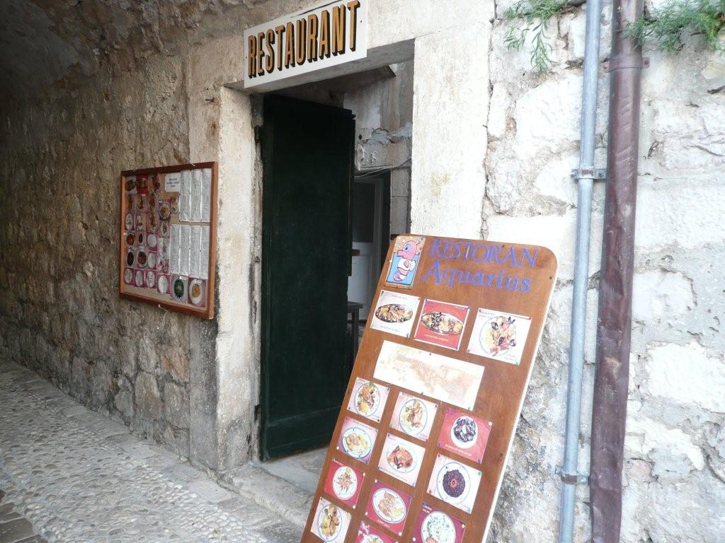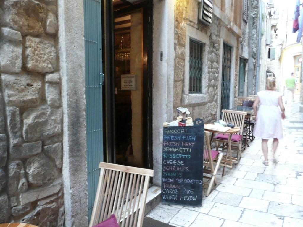 旧市街(ディオクレティヌス宮殿)城壁内にある家族経営の食堂。レストランの標識が無いので見落としがちではあるが、食事の時間帯になるとメニューを書いた手書きの黒板を通り沿いに出している。夏場は路地にもテーブルを出しているが、大変細い路地の為、2人掛けのテーブルのみ。中は小さなホールで大人数のテーブルが4つ程度のコンパクトな作り。