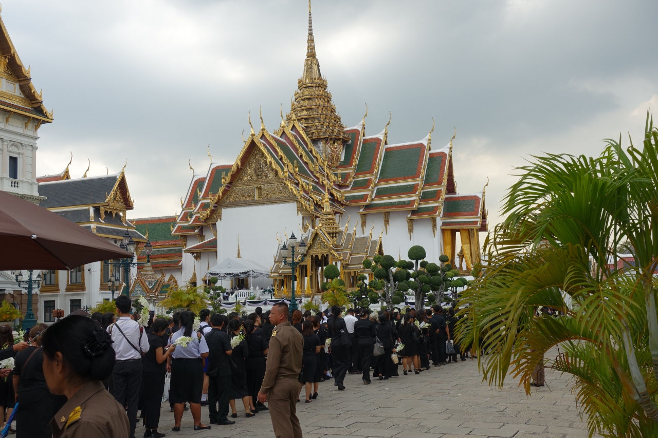 国王が亡くなられて以降、10月いっぱいは入場できなかったワットプラケオですが、11月1日より入場が可能となり、タイ国民をはじめ喪服の方々がお花を持って献花に訪れています。こちらはとても長い列になっていて数時間並ばなくてはいけないようでした。