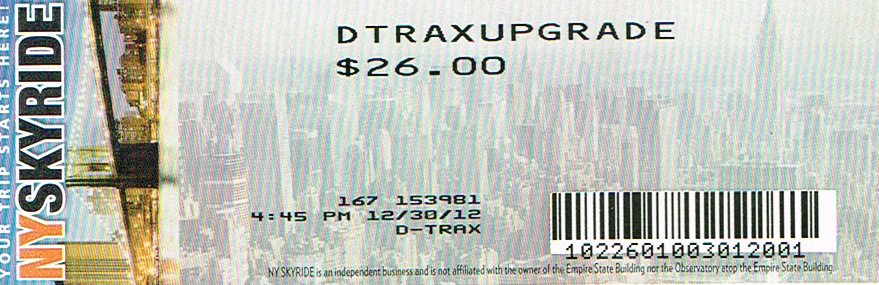 Empire State Buildingに付いたのは12月30日の午後4時でした。年末ということでまずもともとから混んでいて、現地に着いたら、入場待ちの列を整理している係員からCity Passを持っている人の入場の列は2時間待ち、通常の入場列は4時間待ちと言われました。そこでどうしようか悩んでいると、その係が、「すぐに登れるアップグレードがある。$22でアップグレードしたら、その列をショートカットできる」とアップゴレードを持ちかけて来ました。夜の予定もあったので、時間をお金で買うつもりで、アップグレードをうけることにしてその場でカードで支払いをしたら実際は$26。まずここで係のいい加減さがわかりました。さらの「彼がお前達を案内してショートカットさせるから、彼にチップを渡せ」と言われ、7人のグループだったので仕方なく$10渡して中に進みました。