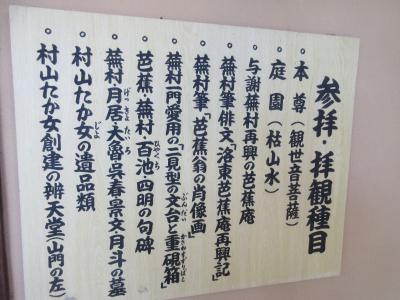 芭蕉が金福寺で閑居していた鉄舟和尚を訪ねて、風雅の道について語り合いをした庵を鉄舟和尚が芭蕉庵と名付けた。その後与謝蕪村が金福寺を訪ねてきた時には庵は荒廃していたが蕪村が再興したそうである。また船橋聖一の歴史小説「花の生涯」のヒロイン村山たか女が尼僧になって生涯を送った寺でもある。境内には与謝蕪村の墓、芭蕉庵、多くの句碑がある。