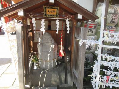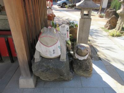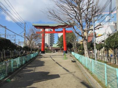 阪神電車高架沿いに目立つ朱色の大鳥居、高さ17メートル、笠木1.6メートル、柱直径1.6メートル。鳥居に掲げられている額面は畳3枚分の大きさだそうである。この神社には、世にも不思議な月像石、しあわせに導いてくれるえびす御像、願い事を稲荷神へと運ぶ願掛けきつねさん、勝負運の願掛け馬勝ち馬さん、恋愛成就の神様猿田彦大神と天宇受命、三浦啓子先生のステンドグラス、招きうさぎさん、ユニチカ記念館から来た二宮尊徳像などこれらを見て回るのも楽しくなる。