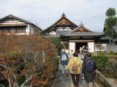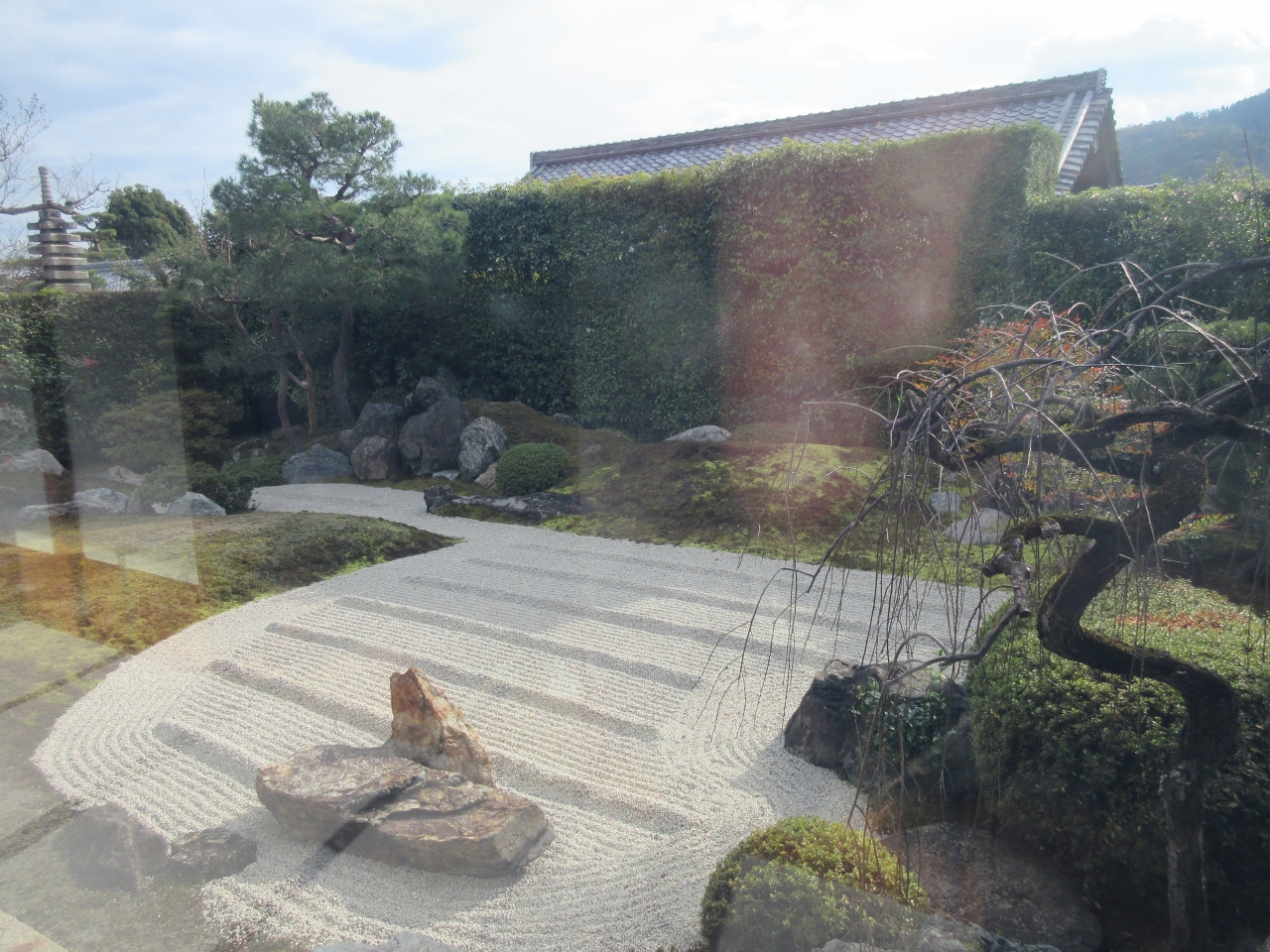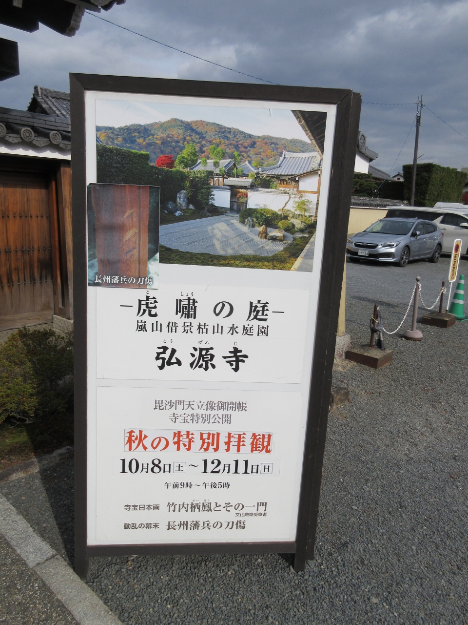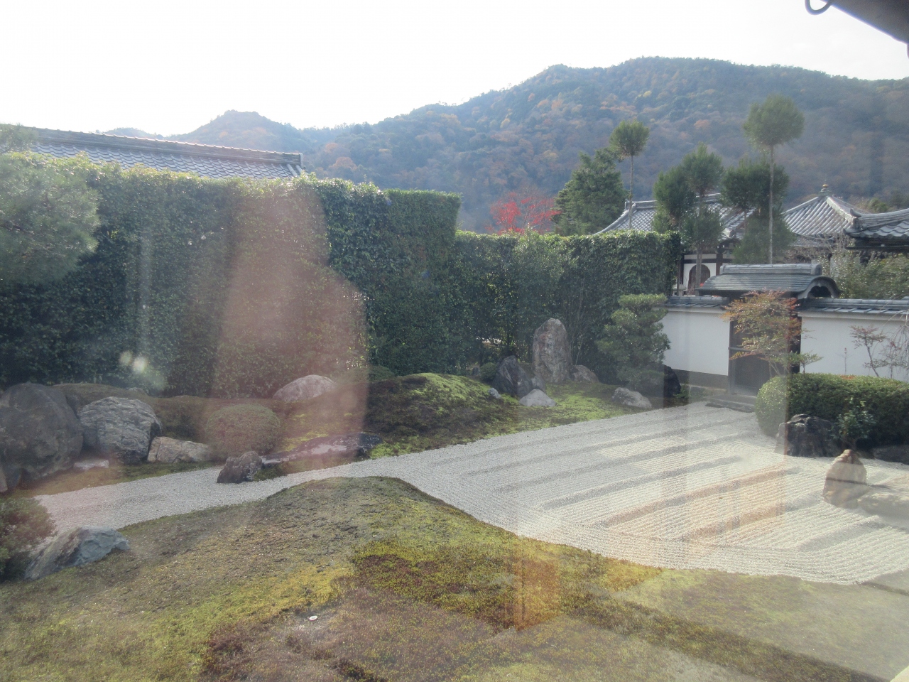 天龍寺の塔頭寺院で嵐山を借景にした枯山水庭園「虎嘨の庭」が有名である。また、京都御所蛤御門の変に際し天龍寺に陣を構えた長州藩に軍勢が試し切りした刀傷が数カ所の柱に残っている。今回は秋の特別公開で虎嘨の庭、刀傷、毘沙門天像、竹内栖鳳とその一門の作品も見ることが出来た。