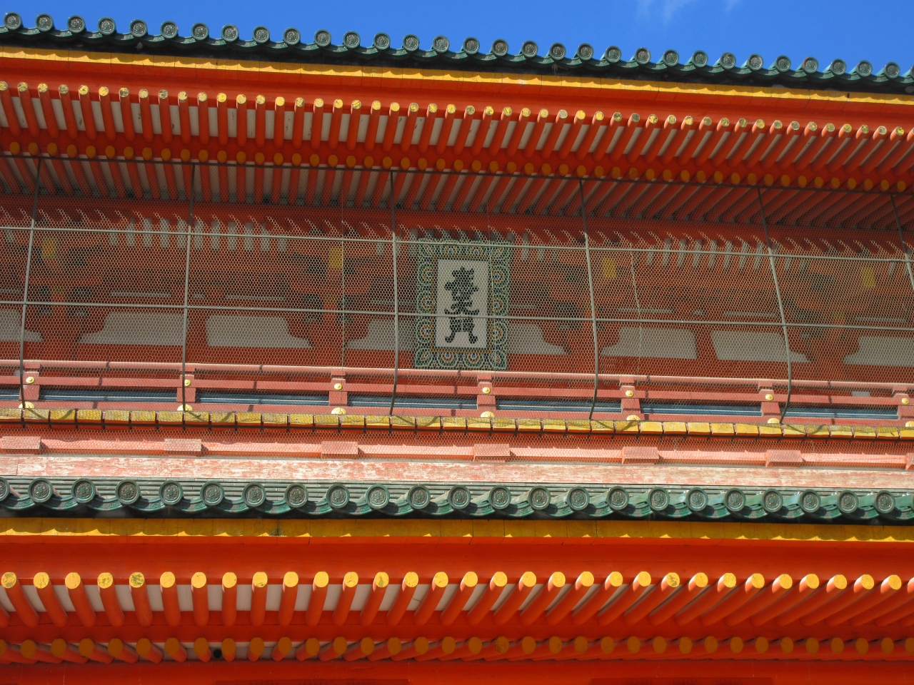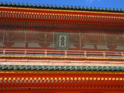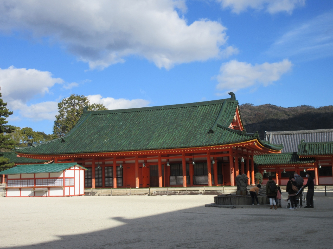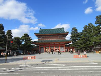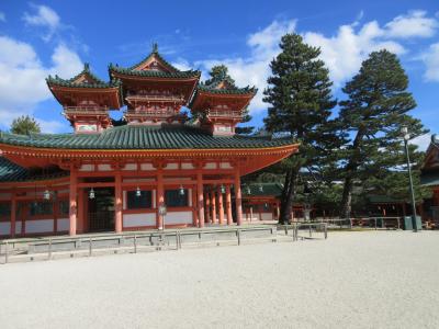 京セラ美術館の前に平安神宮の大鳥居がある。応天門を入るち正面に大極殿、右側に神楽殿、蒼龍楼、左側に額殿、白虎楼があり、白虎楼に神苑入口がある。神苑には、南神苑、西神苑、中神苑、東神苑があり四季を通じて楽しむことが出来る。また有名な時代祭のスタート地点でもある。