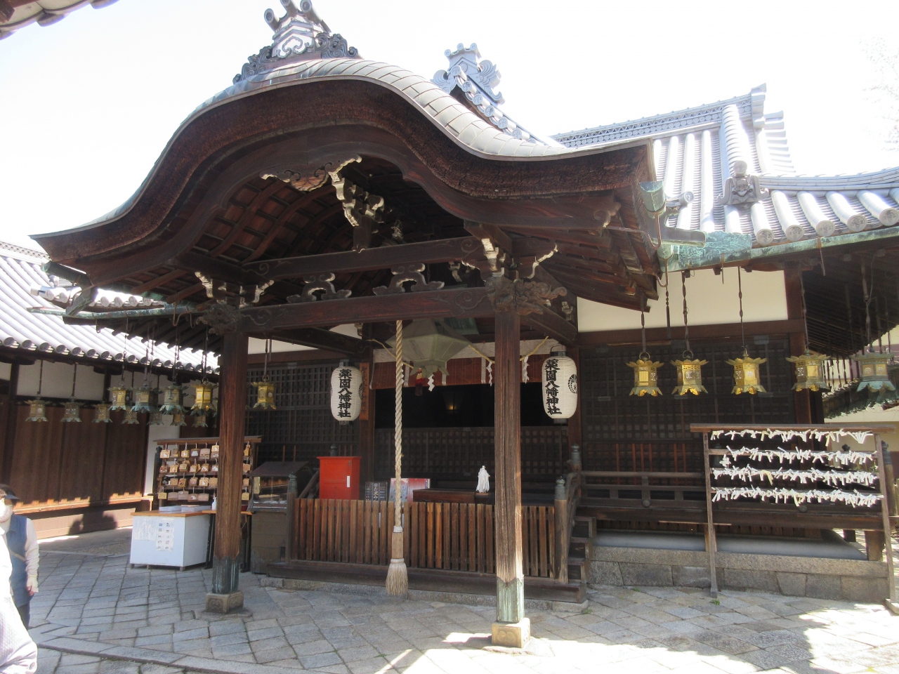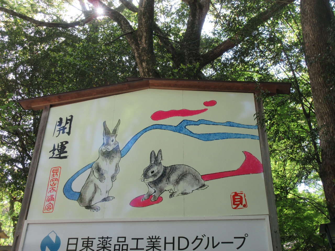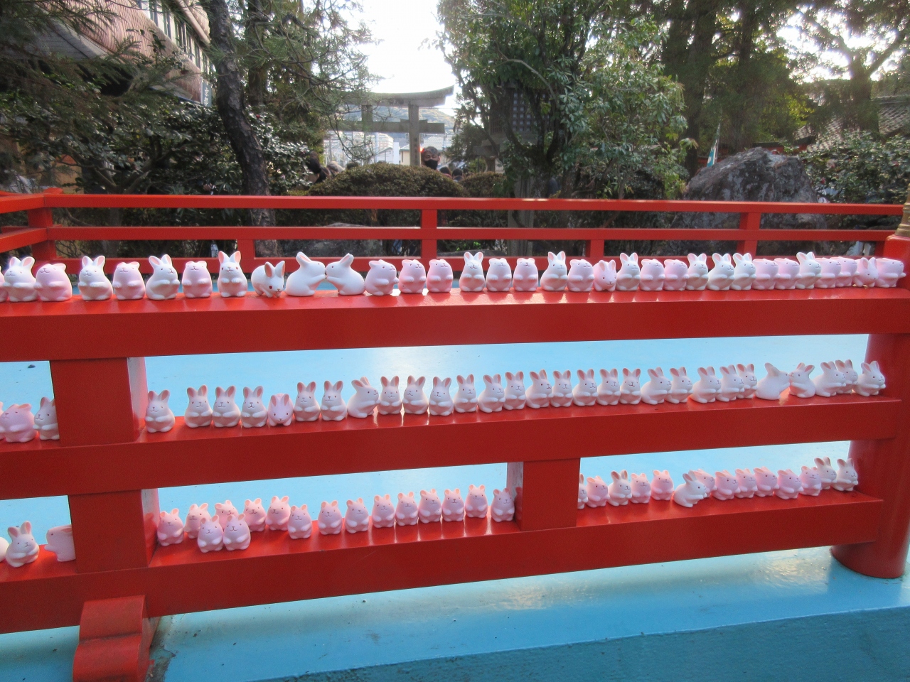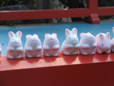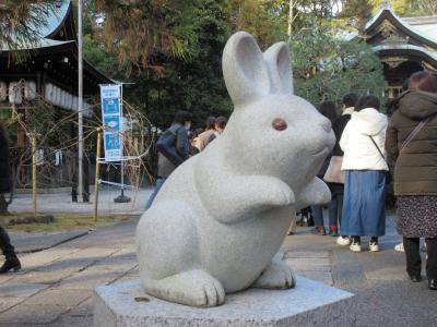 いま京都で大変人気のある「うさぎ神社」こと岡崎神社。境内に入るとまず狛犬ならぬ狛うさぎが歓迎してくれる。今年は特にうさぎの年でもあるために観光バスでの観光客も多く神社は大変な混雑であった。境内には岡崎神社名物ともいえるうさぎみくじの容器(うさぎの体内におみくじが入っている)が参拝者は持ち帰らずに奉納されて並べられています。