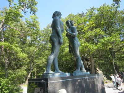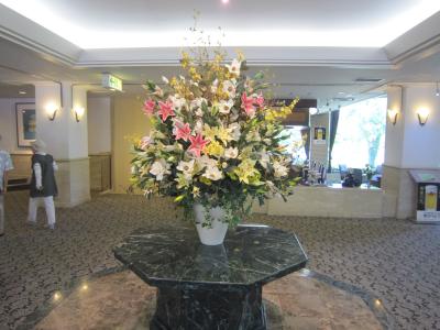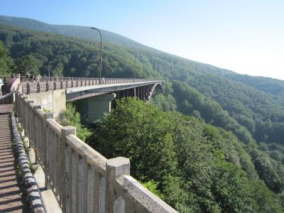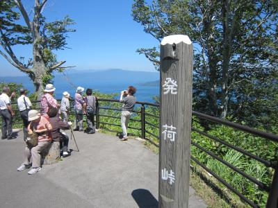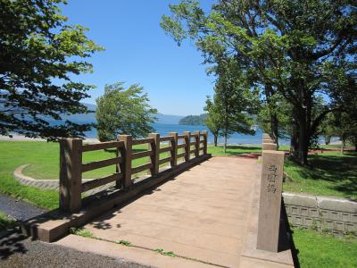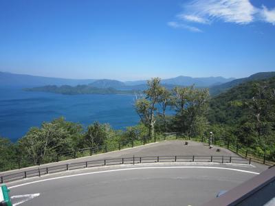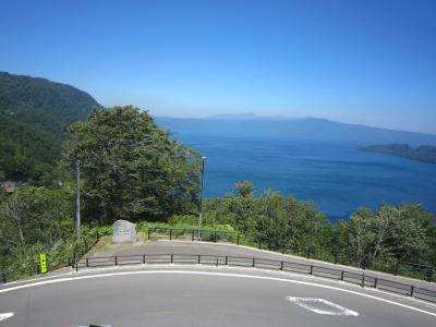 東北4大まつり、青森ねぶた祭りへの途中で昼食のために立ち寄る。発荷峠から降りて十和田湖範囲面するとても風光明媚なホテルであった。昼食は種類も多く味もよく満喫した。昼食の後、ホテルの周辺を散策、十和田湖は穏やかでホテルのすぐそばが県境でホテル側が岩手県で3m位の橋を渡ると青森県という地形にある。