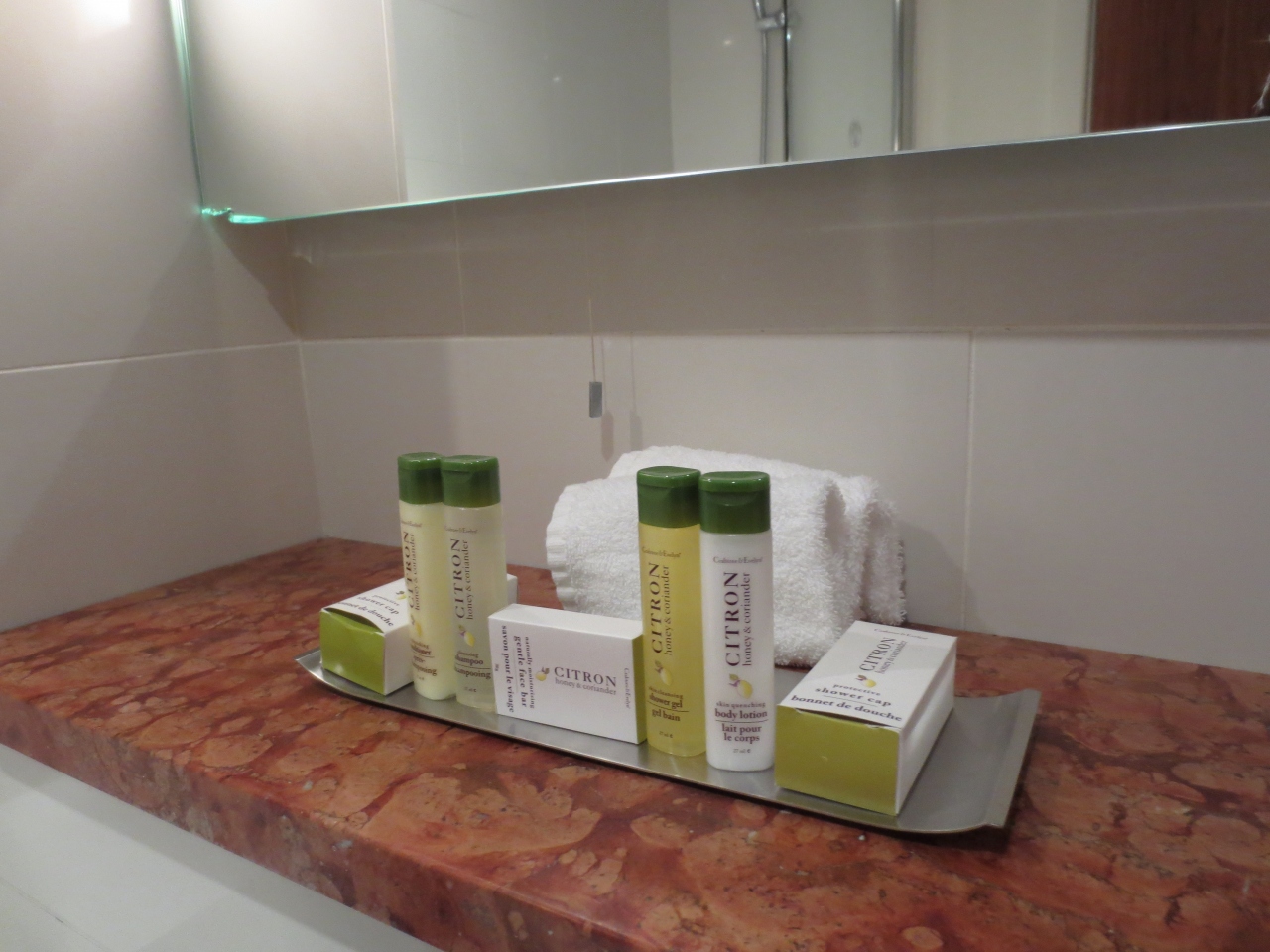 客室は広さはないが天井が高く狭さを感じませんでした。バスタブとトイレが分かれていたのは良かったのですが、バスアメニティは非常に少なくボディ&ヘアと書かれたものが1種類あるのみで、シャンプー、歯ブラシはありませんでしたのでご注意下さい。