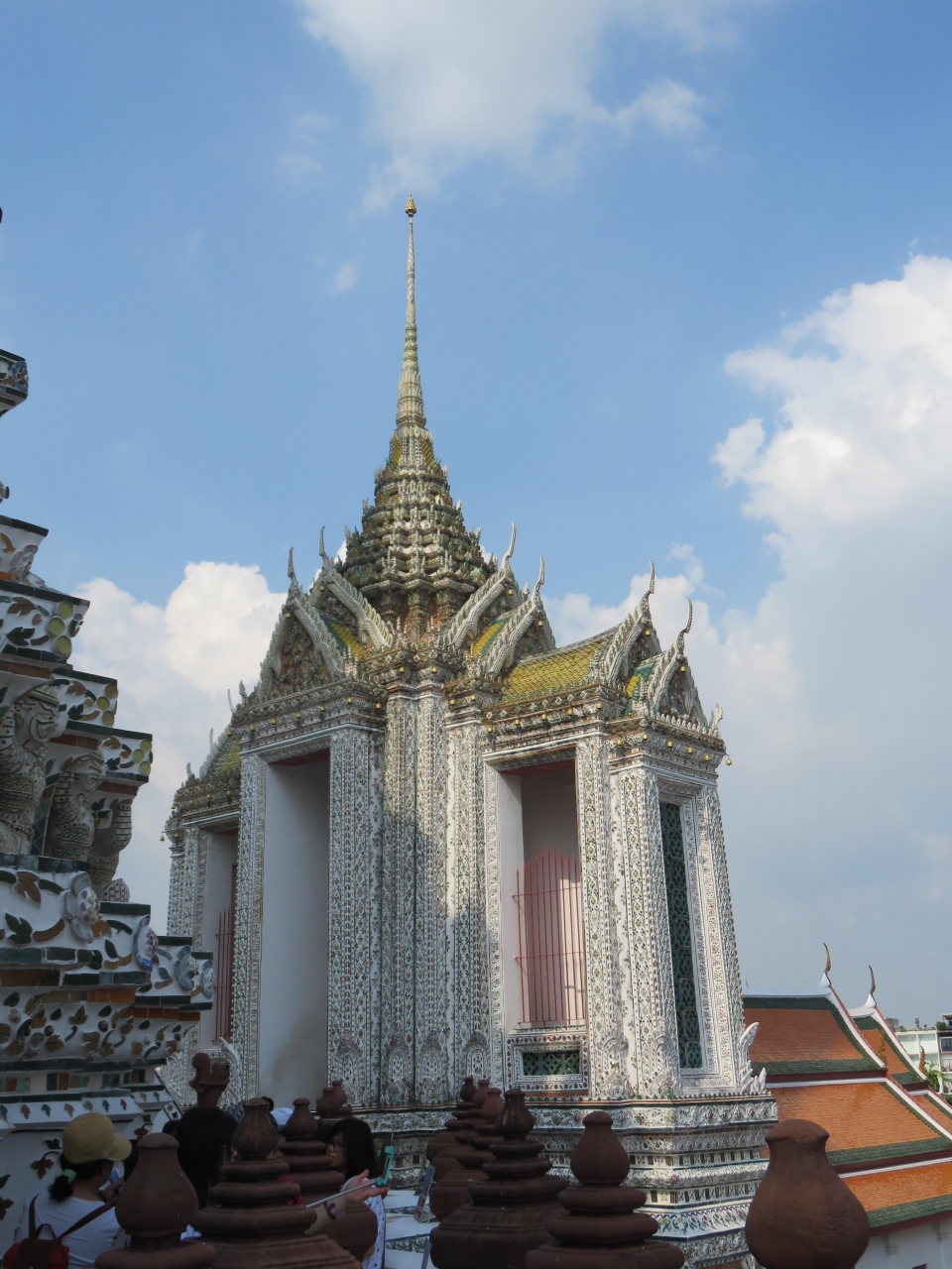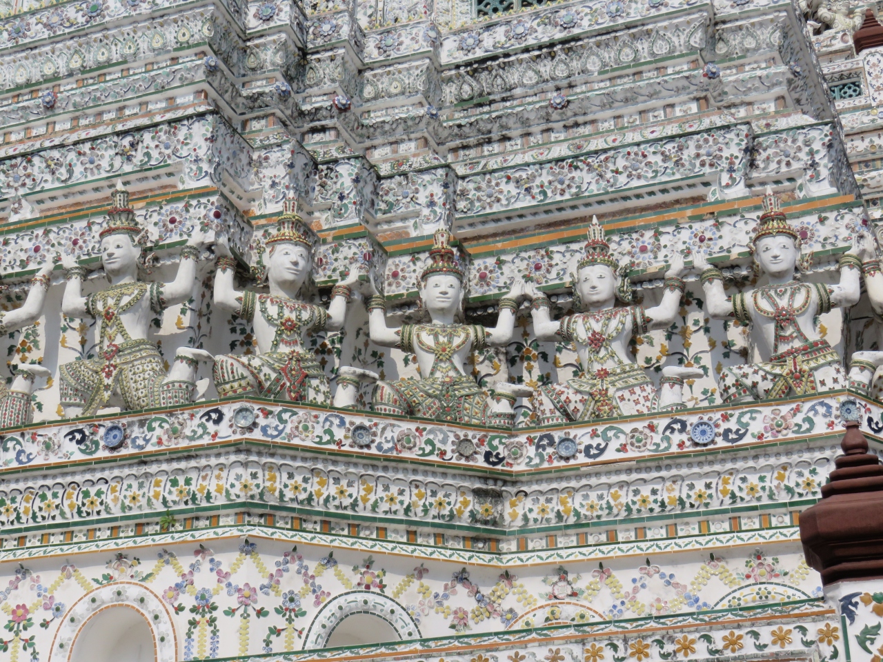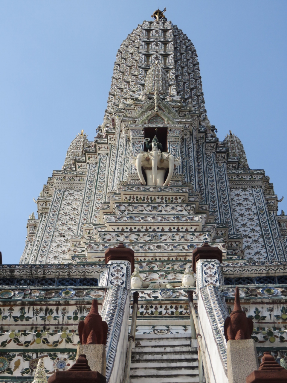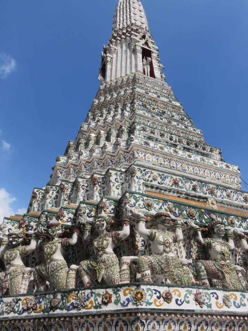 ワット・アルンを代表するのが大仏塔ですが、ヒンズー教の神であるインドラ神がここに祀られています。この塔はクメール様式で色彩も鮮やかに装飾されていますが、塔の尖塔には象に乗ったインドラ神が祀られている様でした。