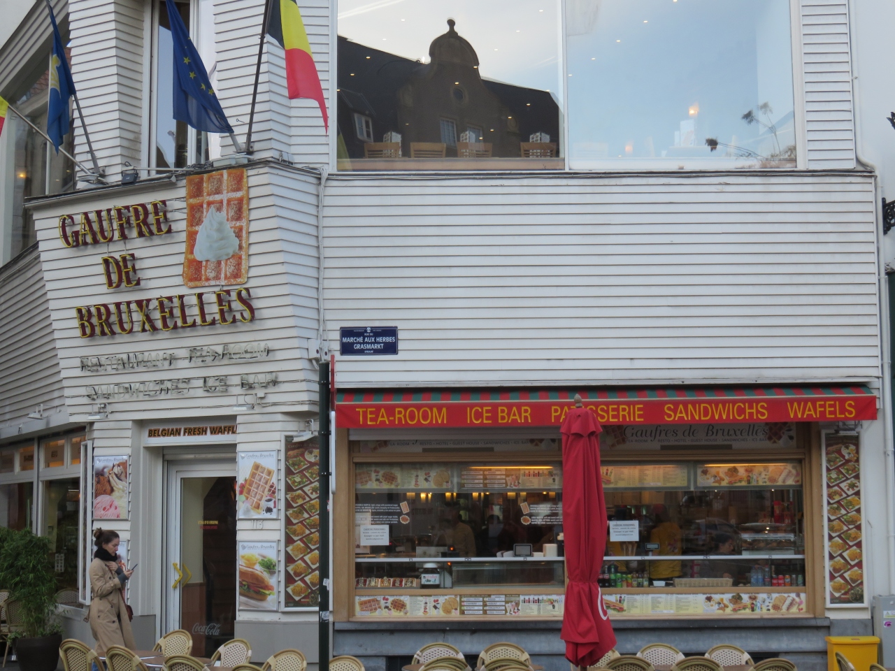 ブリュッセルでは、ワッフルを食べようと考えていたのでこの店を選びました。ここでは軽食も食べられますが、なんと言っても店名であるブリュッセルワッフルです。ワッフルには2種類あり、見た目は大きいけど軽くてサクッとしたブリュッセルワッフルと、見た目が小さめで、ザラメ入りのもっちりとしたリエージュワッフルを楽しみました。