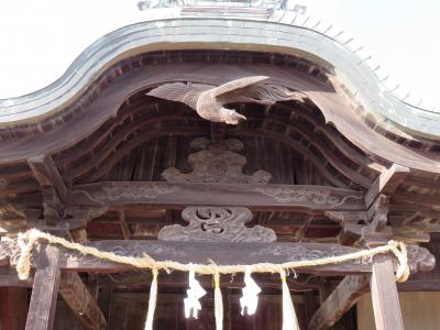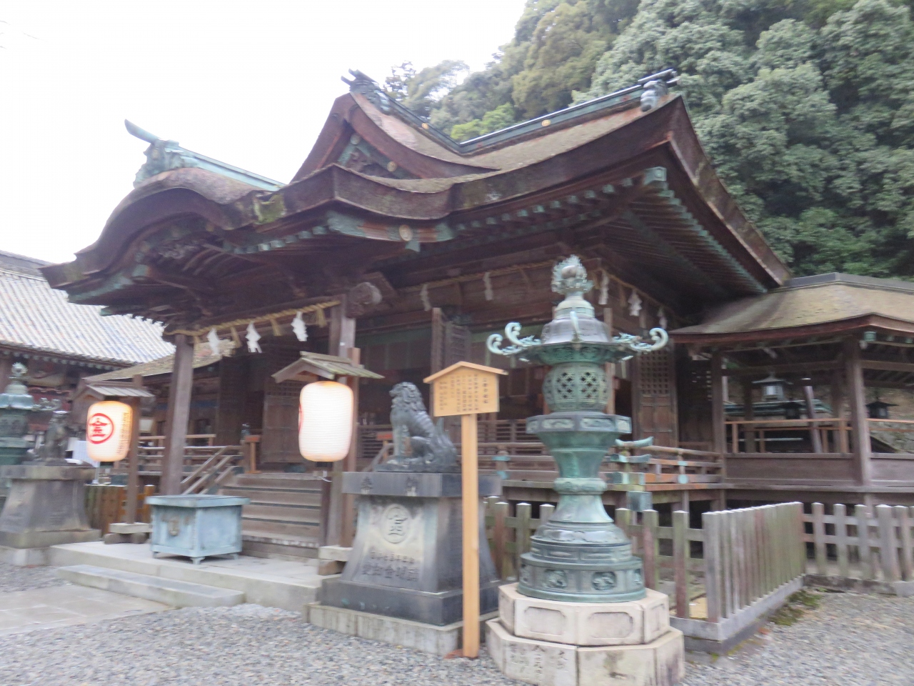 社殿は、高さ約18m、銅板葺総欅造二重入母屋造の荘厳な建物で、上層の屋根裏には巻雲、柱間や扉には人物、鳥獣、草花の彫刻が施されていました。余りの社殿の荘厳さで本殿と間違えてしまう程の建物でした。本殿まではこの先にある急な石段を登る事になります。