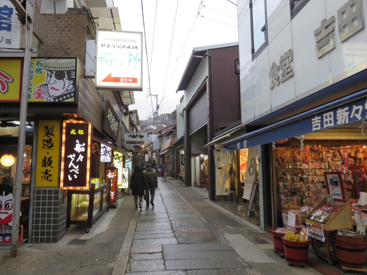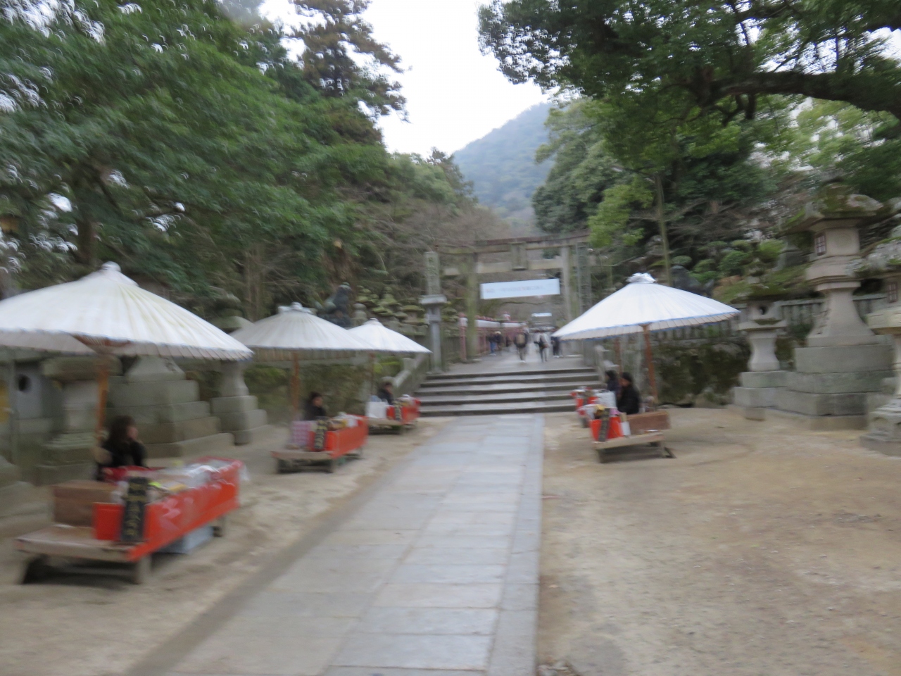 大門をくぐると、白い大きな傘をさして飴を売る5軒の店があります。先祖代々、境内の神域で商いをすることを許された「五人百姓」で、販売している「加美代飴」は古くから参拝客に親しまれているこんぴら名物の一つのようでした。