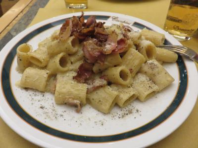 スペイン広場に続くコンドッティ通りにあり、ローマ市内を散策して 宿泊ホテルに帰る途中に食事で立ち寄りました。店の前の道路にもにはテーブル席も用意されていて、賑やかさを感じるのですが、店内は比較的空いていました。カルボナーラを注文したのですが、手元に届くのに少々時間を要したので、美味しさも半減しました。
