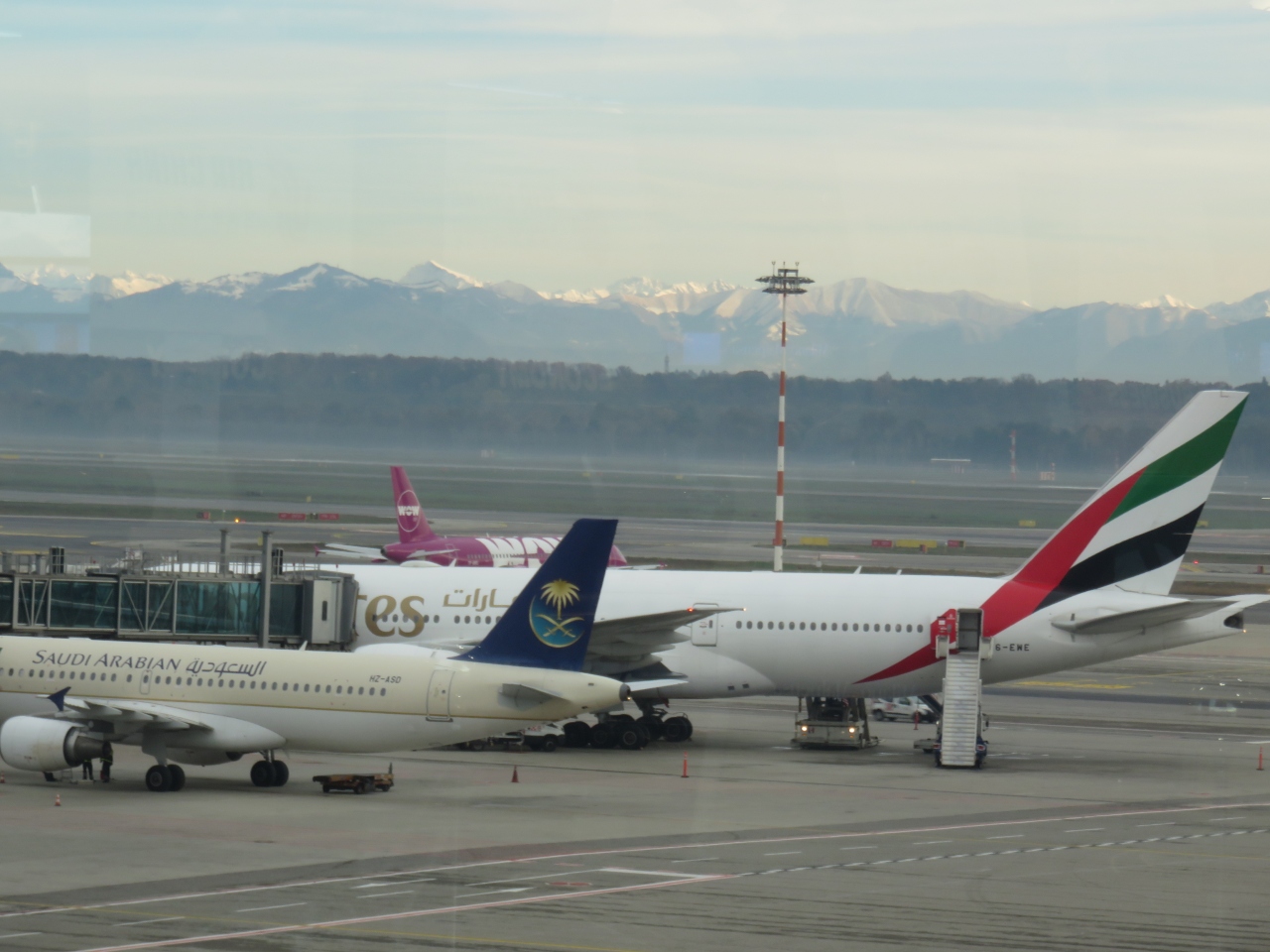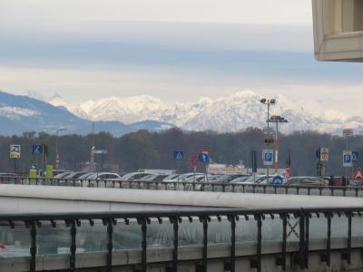空港からの景色で遠くに見えるアルプス山脈には、雪が積もっていてとても奇麗でした。空港内では飲食スペースが少ないように感じられましたが、