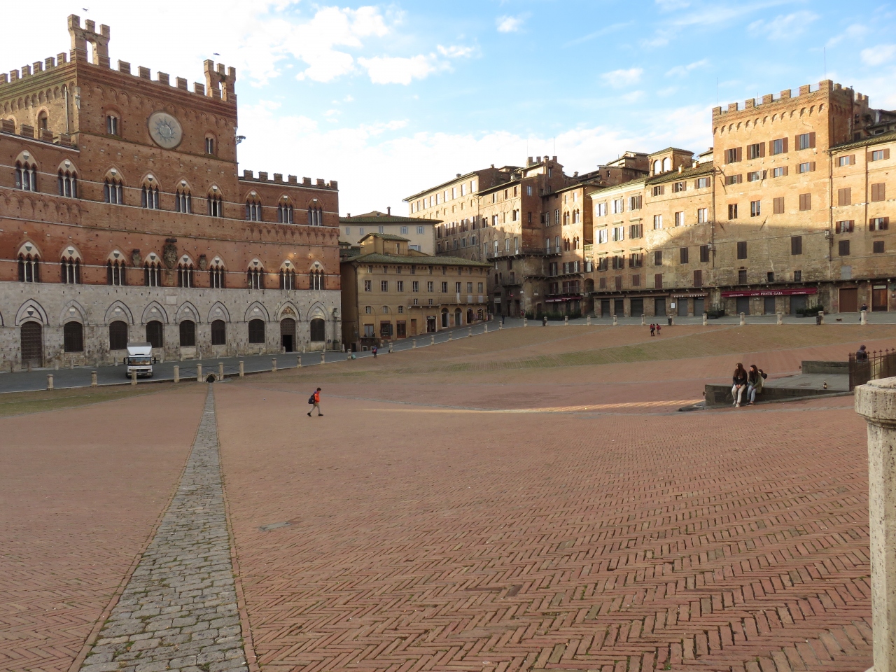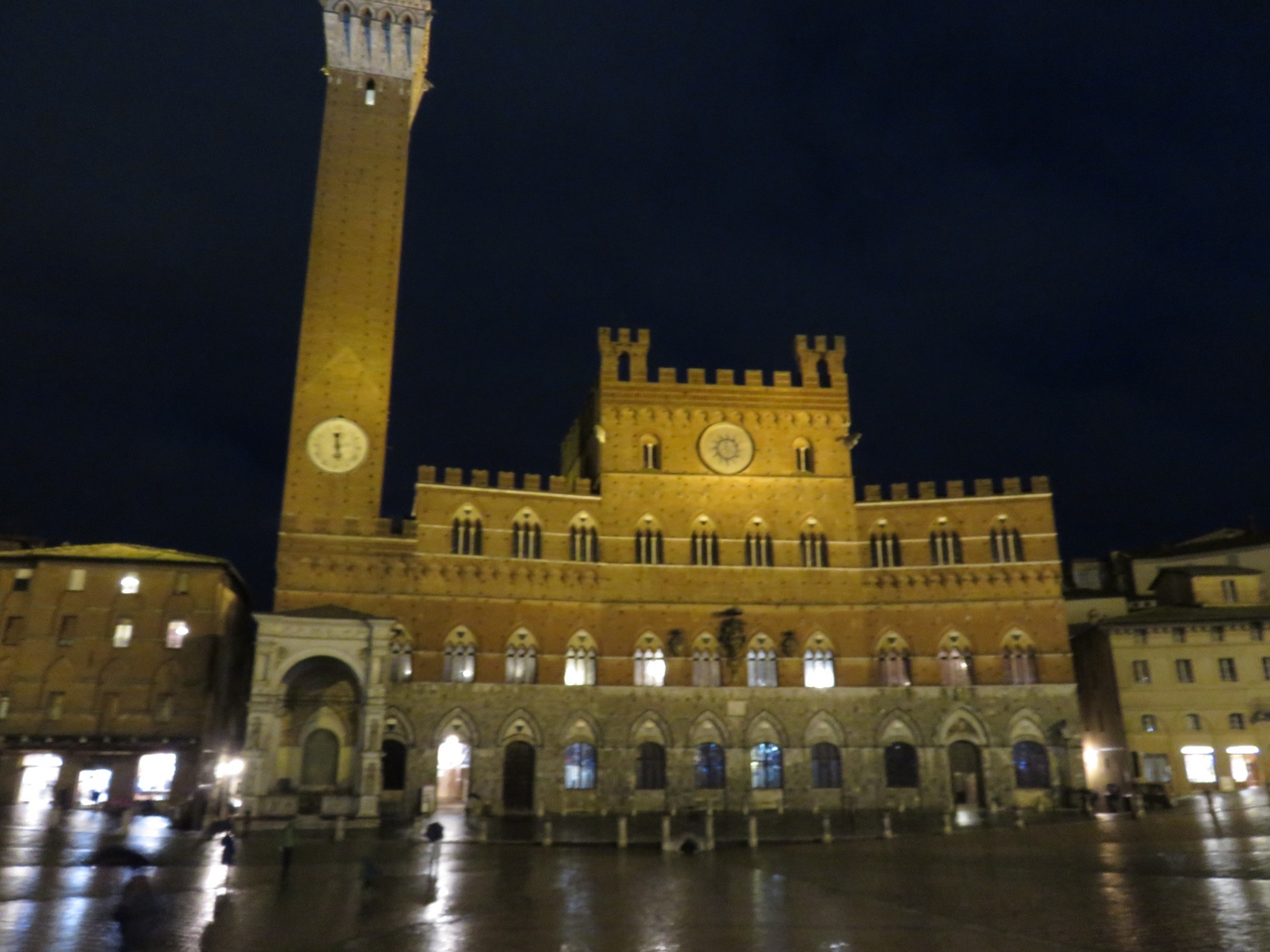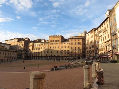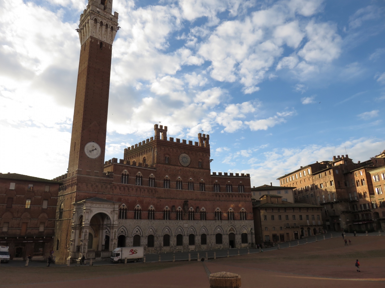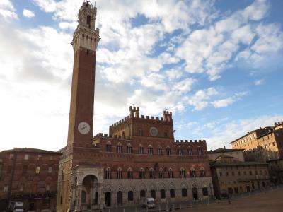 世界遺産シエナ歴史地区の一番の見所はカンポ広場で、その広場に隣接する建物で14世紀に建てられたプッブリコ宮が市庁舎になっています。1階の一部は出入り自由になていたり、2階部分では市立の美術館にもなっていました。 広場に面してしる関係か、かすかに湾曲している建物に驚きました。