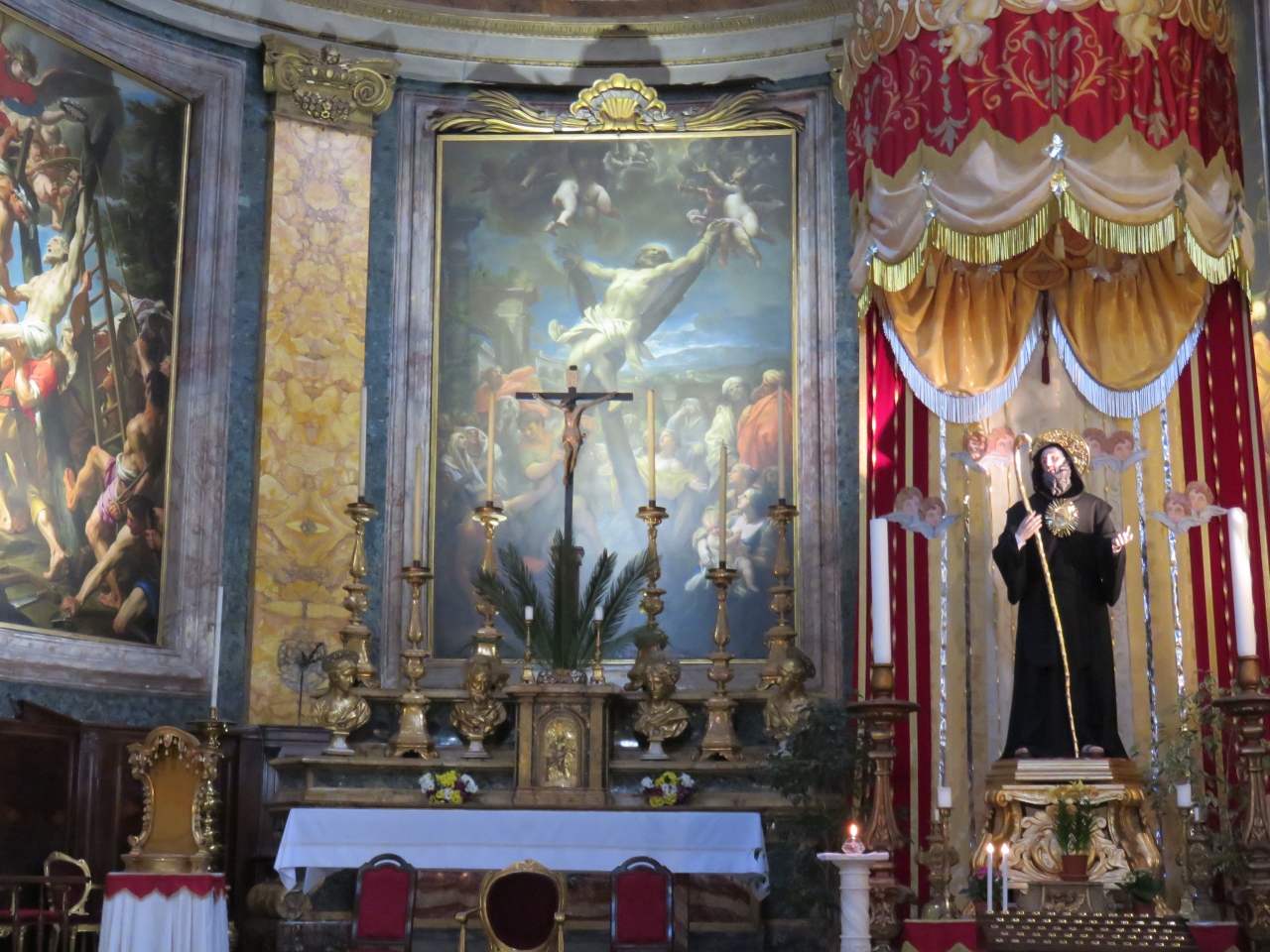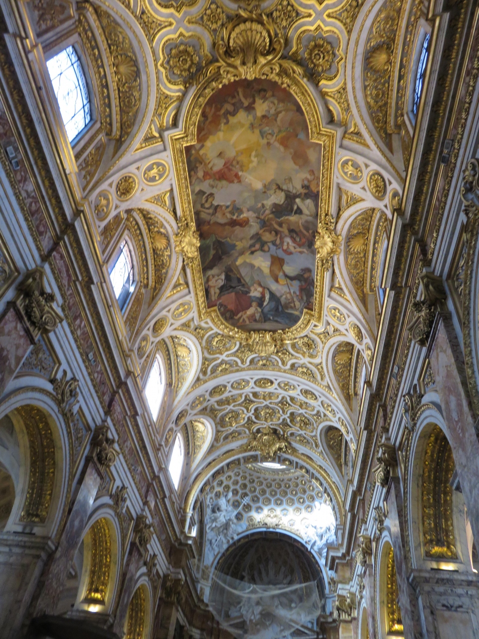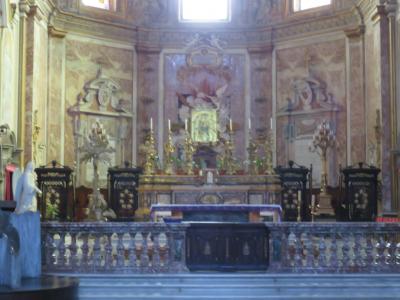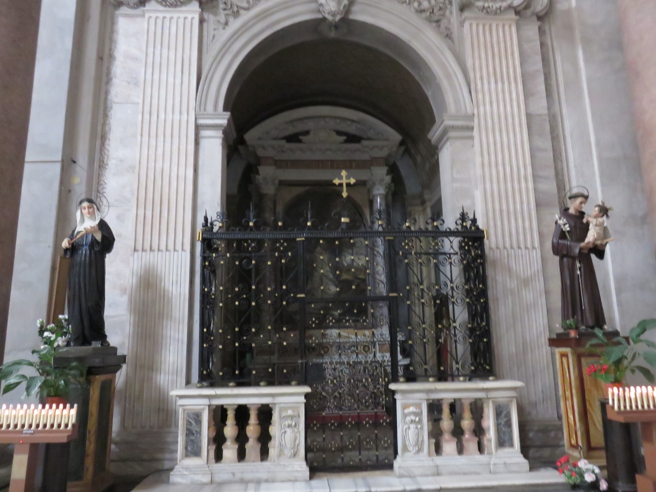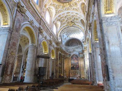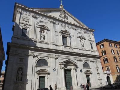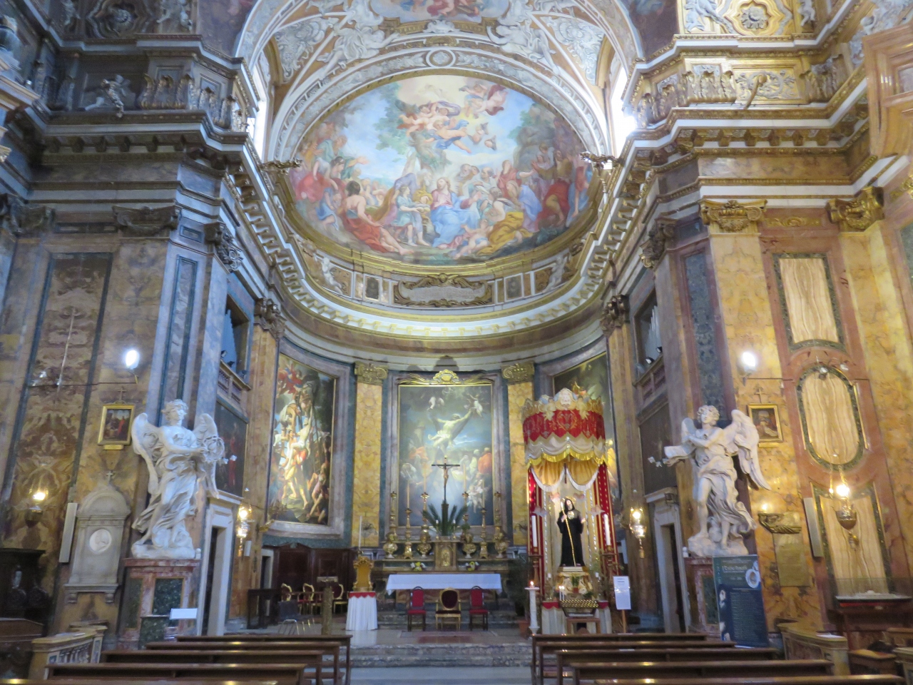 教会は12世紀に創建さられたものです。その後17世紀に再建され、ボッロミーニがドームと鐘楼を付け加えたようです。主祭壇とその脇にあるベルニーニのサンタンジェロ橋の天使像のオリジナルが見られます。主祭壇の天井と側壁のフレスコ画が奇麗でとても印象深いものでした。