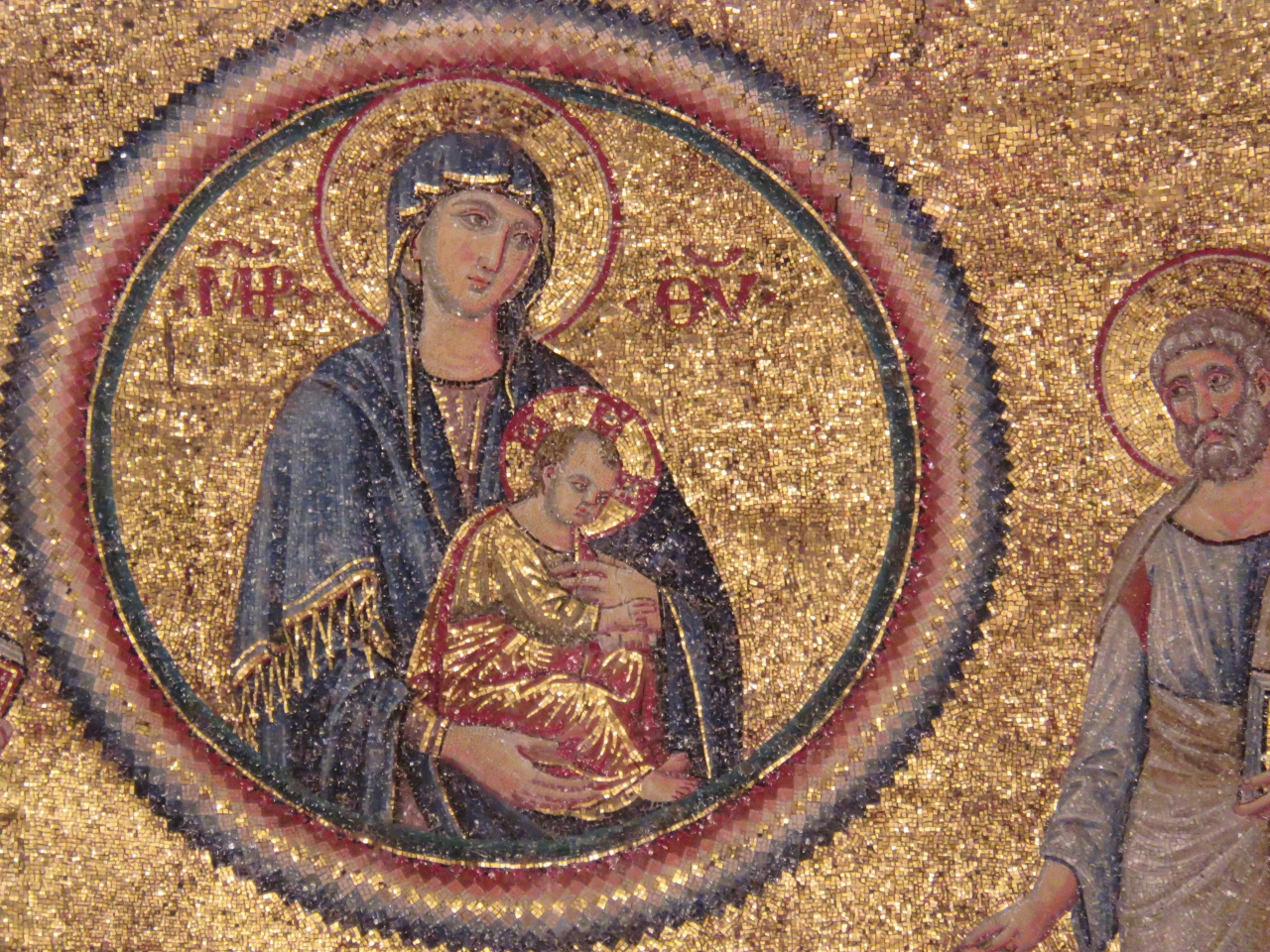 ローマ初の聖母マリアに捧げるための教会として造られ、その後もたびたび改修され、12世紀半ばに今も残るロマネスク様式の聖堂となったようです。聖堂の内部は、3身廊のバジリカ様式で造られていて、16世紀初頭に改修された金箔で彩られた華麗な格天井には、ドメニキーノの「聖母被昇天」の絵が描かれていました。豪華な天井やモザイクが奇麗で見とれてしまいました。