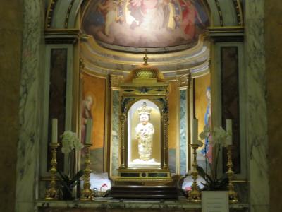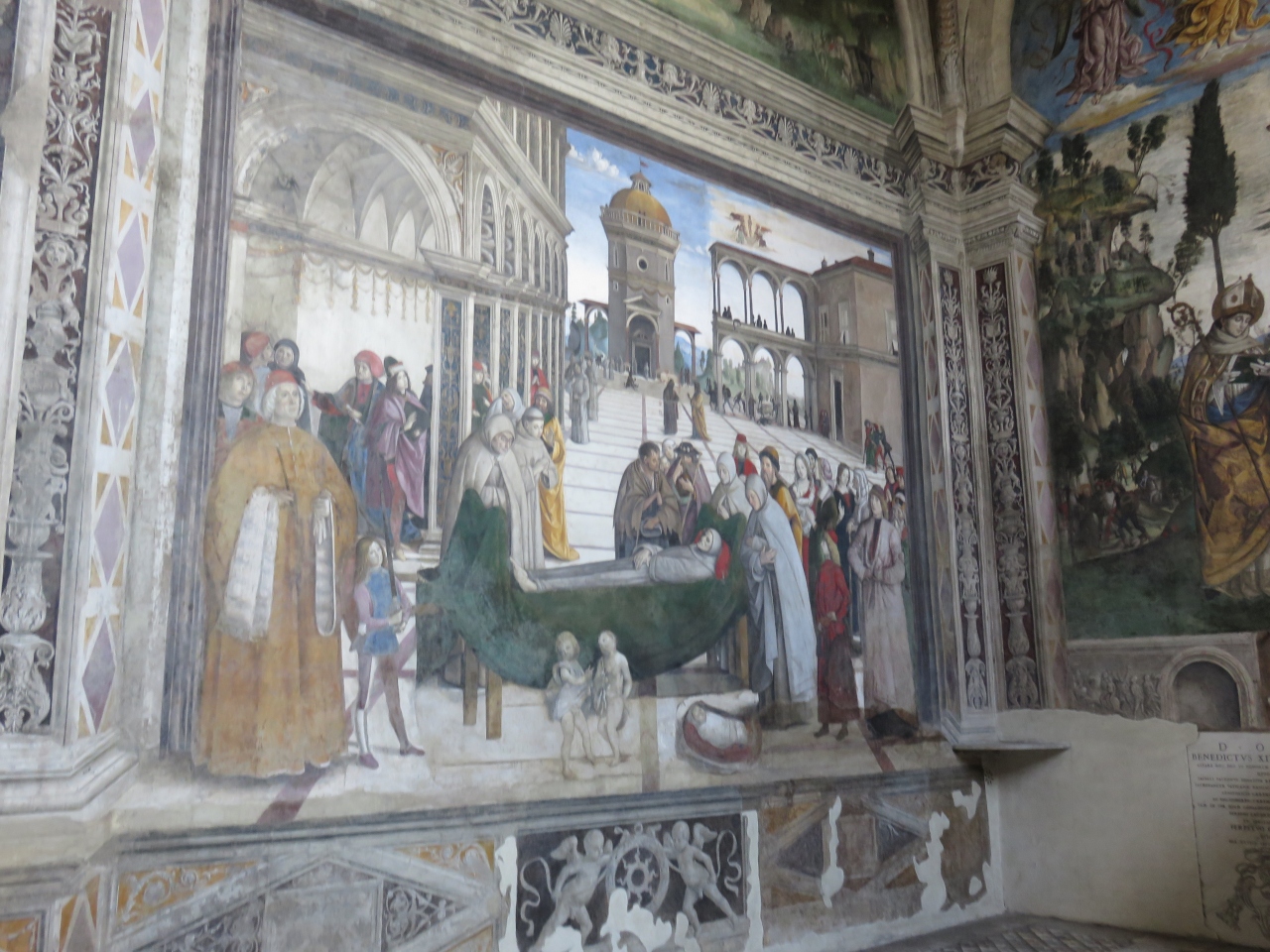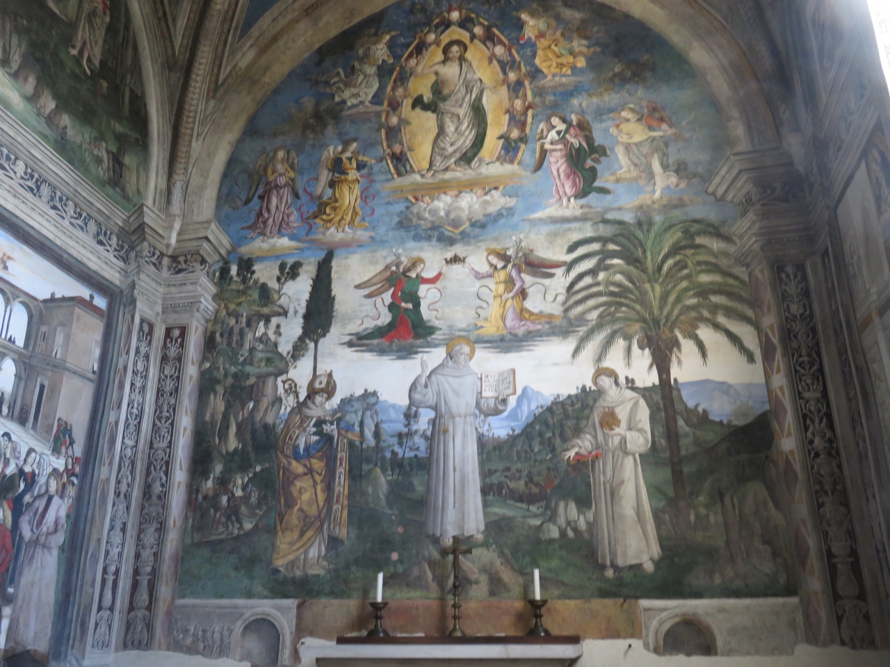 教会の中央に安置されているのは、ローマでは古くから奇跡を起こすと信じられている幼子の像です。この幼子の像は、15世紀にフランチェスコ派によって、イスラエル・ゲッセマネのオリーブの枝で作られたものだそうです。ピントゥリッキオの作品で、聖ベルナルドの死が描かれているフレスコ画がとても印象的でした。
