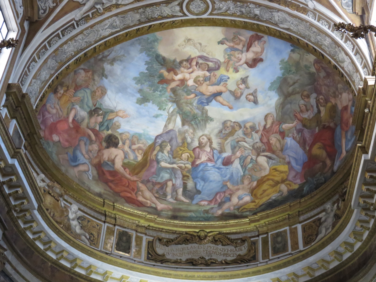 何度でも訪れたい教会の魅力は、天井の装飾とフレスコ画が印象的です。「聖アンドレア伝」のフレスコ画には、漁師をしていた聖アンドレアがキリストの弟子になる場面から、十字架にかけられて殉教するまでの生涯が描かれています。重厚な造りで天井が高くクーポラの絵も見ごたえがありました。