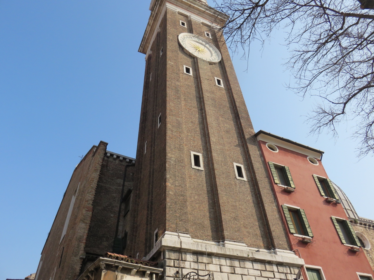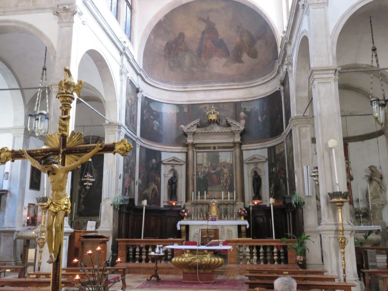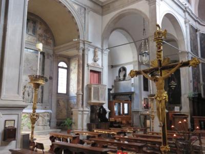 リアルト橋から5分ほどで、観光客もあまりいないこの場所には広場もあり、カフェや木陰にあるベンチで休む事も出来ました。レンガ造りの高い鐘楼が目立ったので立ち寄りました。教会内部は落ち着いた雰囲気で、装飾の派手さは無いですが、心休まる空間でした。