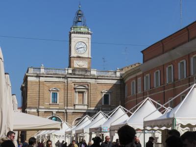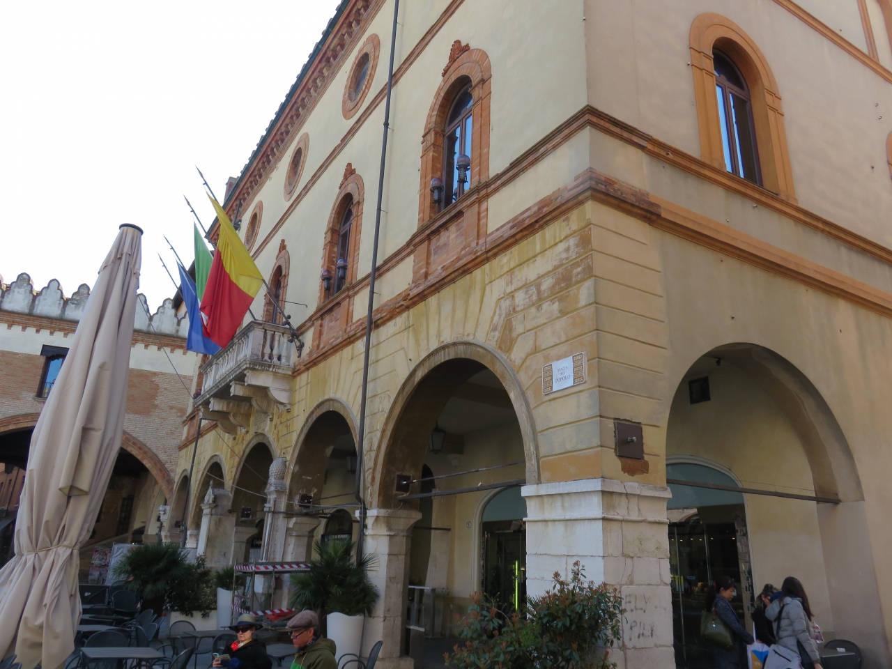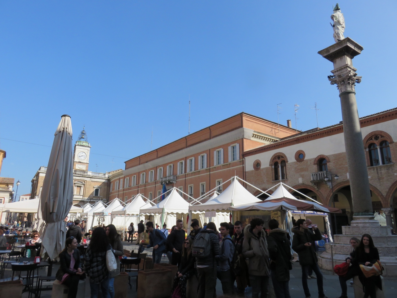 ラヴェンナ駅からまっすぐに伸びるファリアーニ通りを行くとラヴェンナの中心部にあるポポロ広場にでます。広場への門のように建つ2本のコロンネ・ヴェネツィアーネは、1483年のもののようです。訪れた当日は、出店も並んでいて賑やかでした。