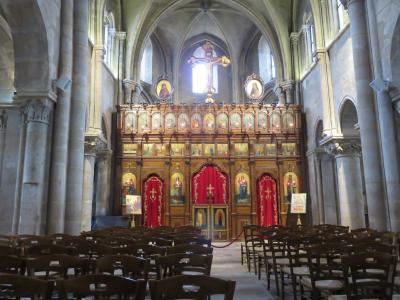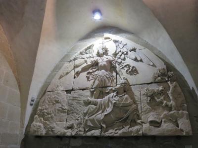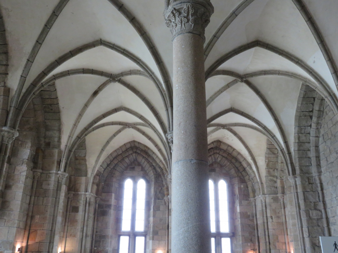 2階部分には、王族や貴族など身分の高い信者を受け入れた迎賓の間がありました。列柱や天井が美しい華やかなゲストルームで、フランス王をはじめ、身分の高い巡礼者を迎えたのでしょう。中世における最も優美な建築物のひとつのようです。騎士の間の柱と比較すると、少々細い気がしました。