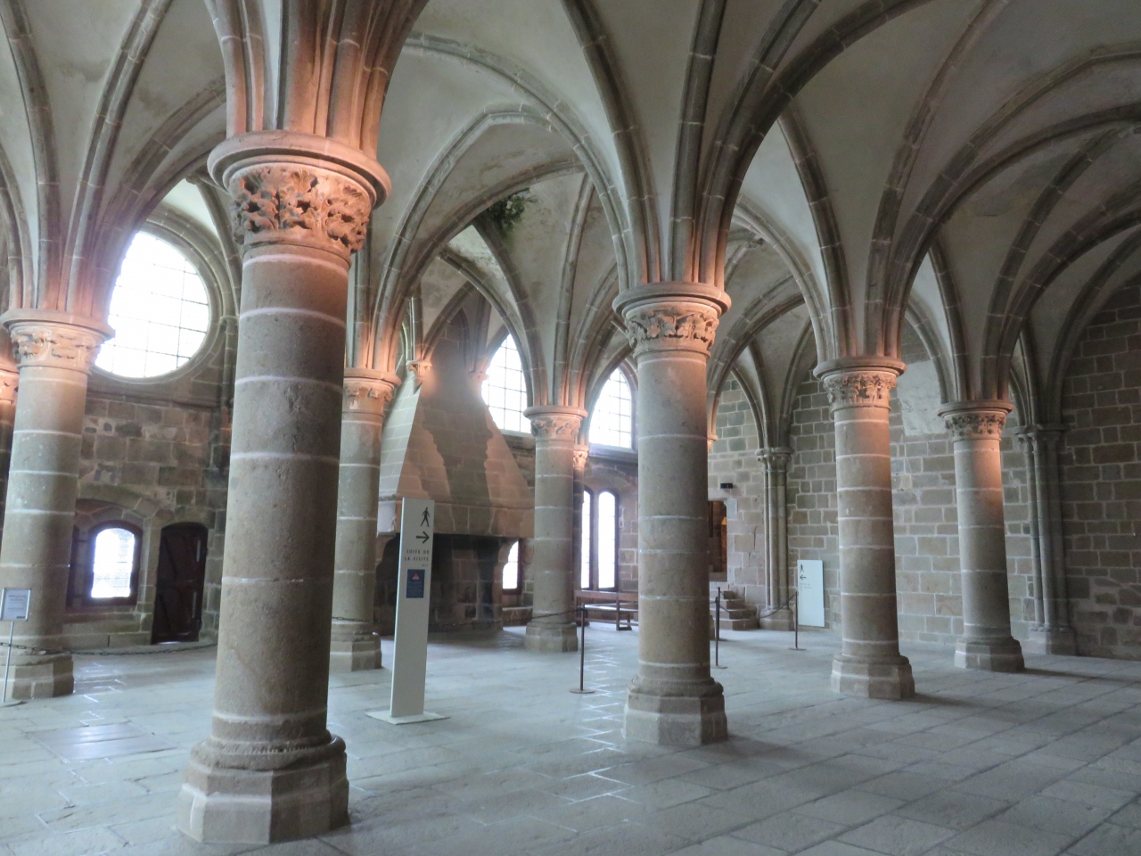 ロマネスク様式の修道院の中心となる通路で、修道僧の遊歩道は、2つの身廊をもつ長い部屋を抜けてると次の間へ、交差リブの円天井という建築様式で、12世紀初めのゴシック芸術を見る事が出来、王族や貴族の従者たちの為の物ようです。普段は修道士たちの仕事部屋として使われていたようです。太い柱が何本も天井を支えていたのが印象深いです。