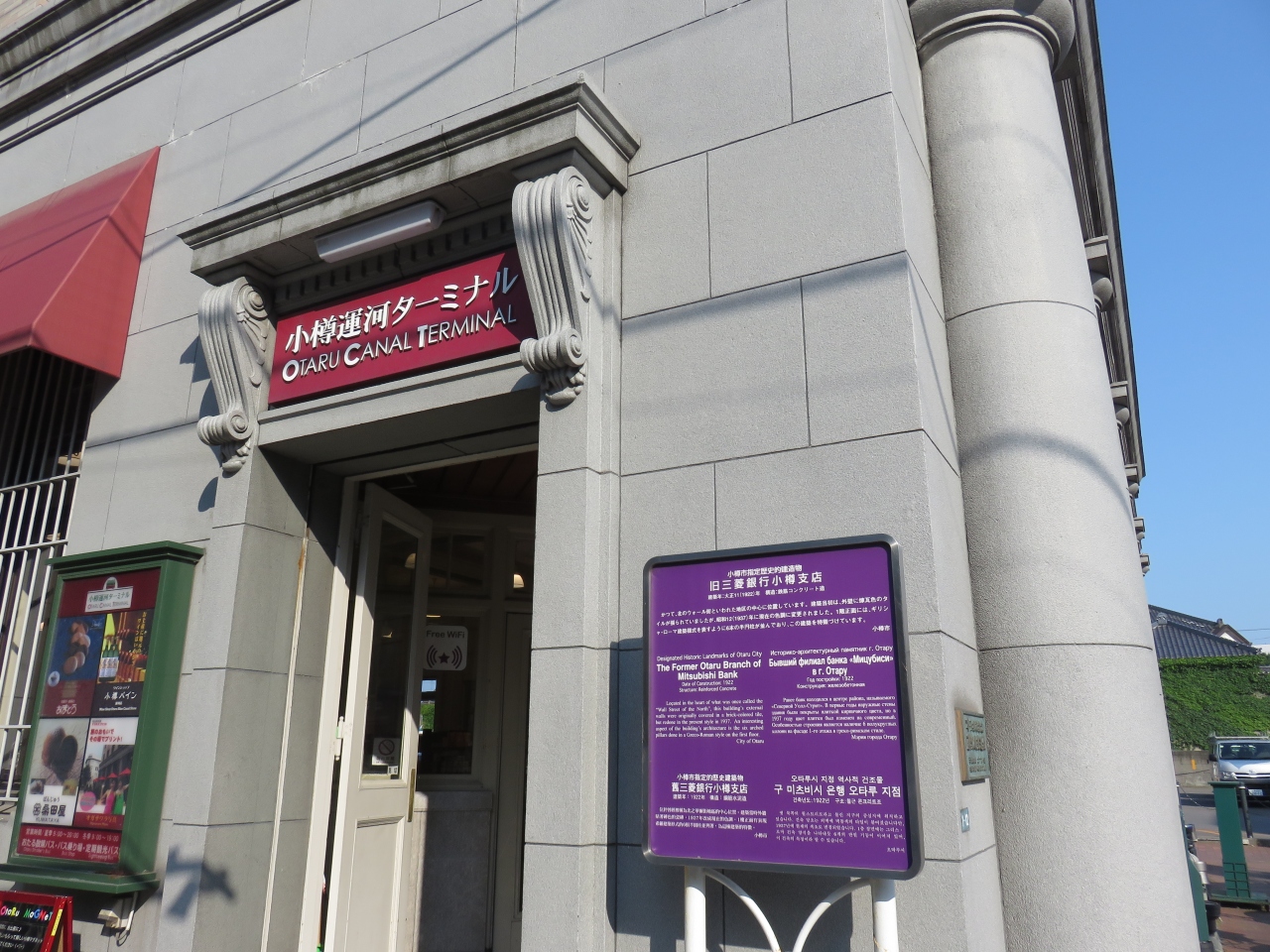 大正11年に進出した三菱銀行の小樽支店だったもので、当時は三菱系の会社が入るビルで、2階に鉱業・3階に商事会社が入っていて、エレベーターの付いた建物は珍しかったようです。現在はバスターミナルを兼ねた土産物売り場になっていました。