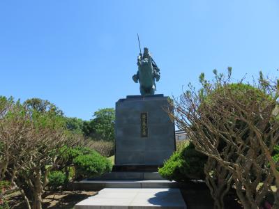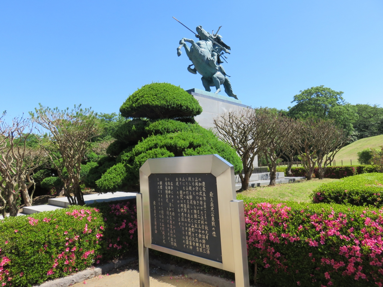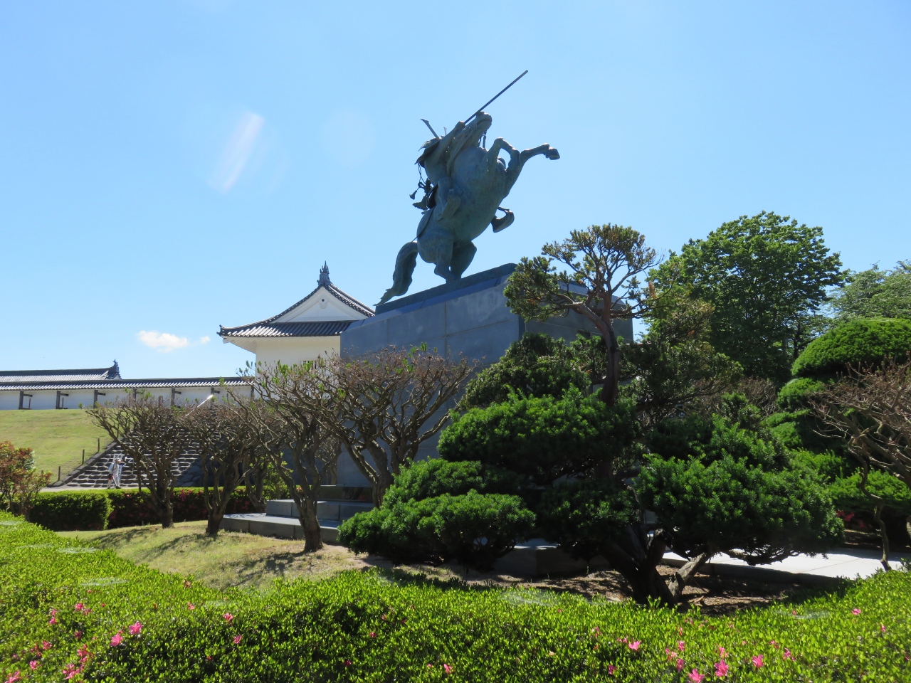 山形城跡の二の丸東大手門をくぐると、二本足で立つ勇ましい騎馬像が
