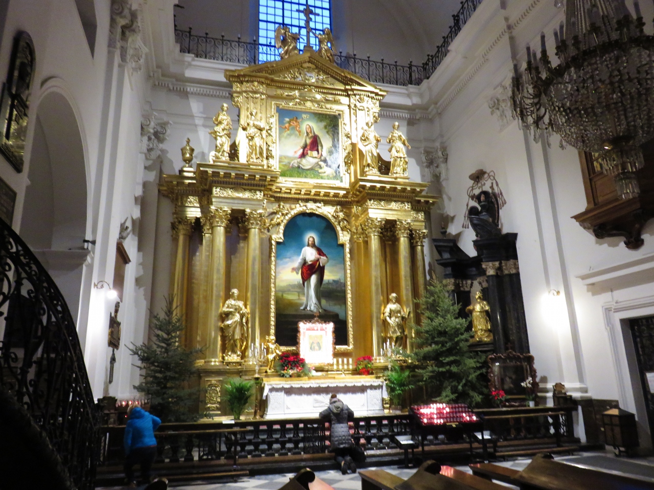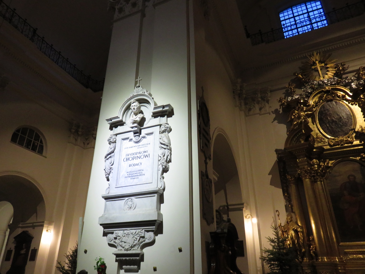 教会の入口前には十字架を背負ったキリスト像が建てられていて、何となく威圧感を感じました。教会に入ると祭壇の左手前にある石柱の下にはショパンの心臓が埋められていると説明がありました。