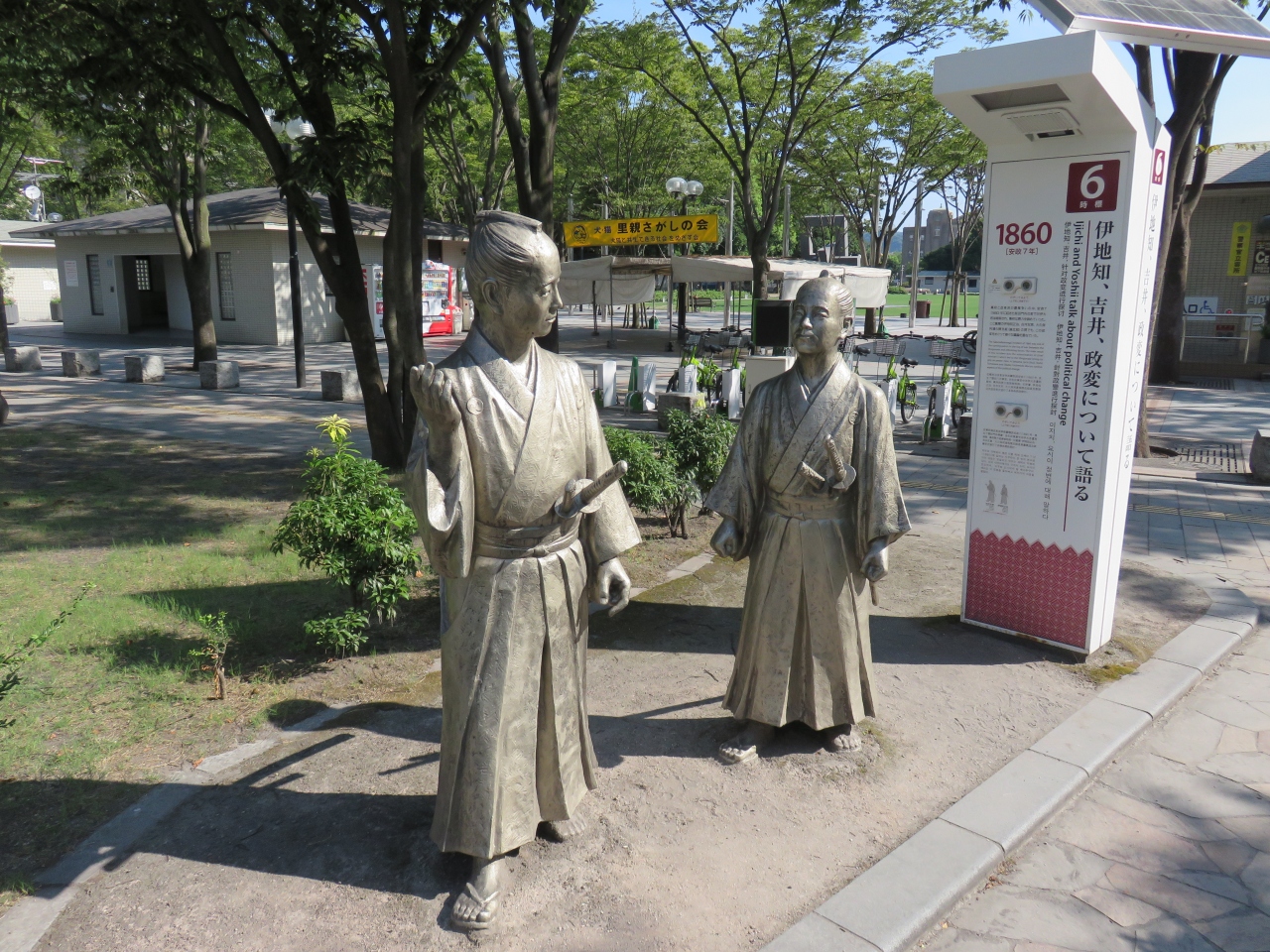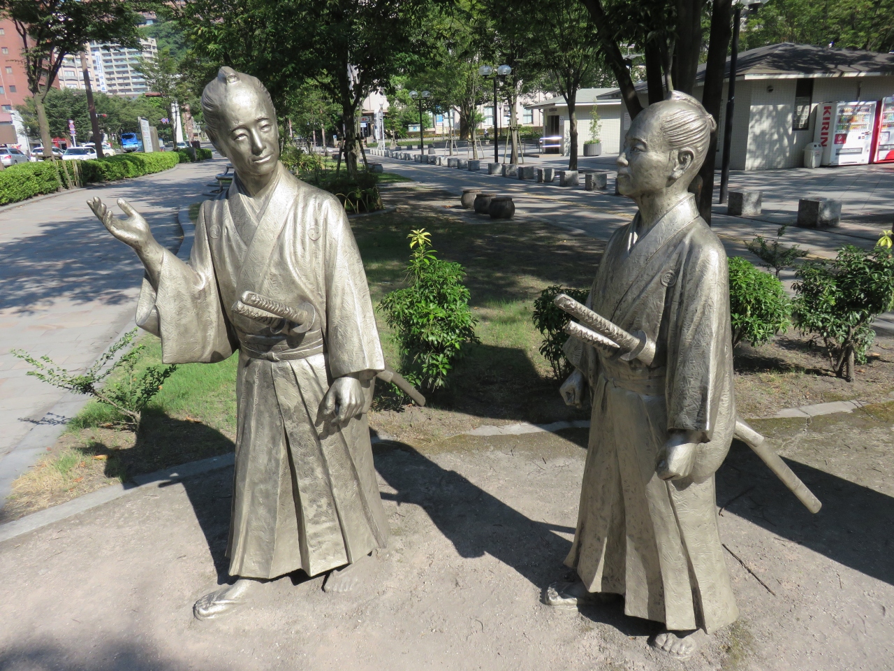 中央公園の南側に建つブロンズは、幕末の雰囲気を感じさせるように