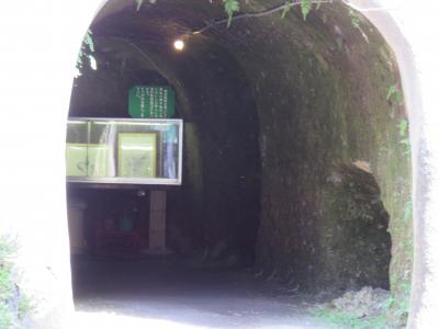 隆盛像の左に人工と思われるアーチ形の洞窟が口を開けていて、