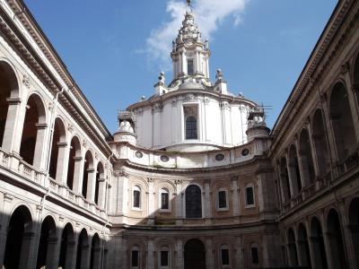 ナヴォーナ広場の東側にあり、楕円形の中庭の奥に立つ教会は塔の上の方が