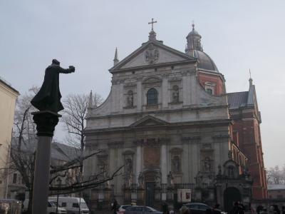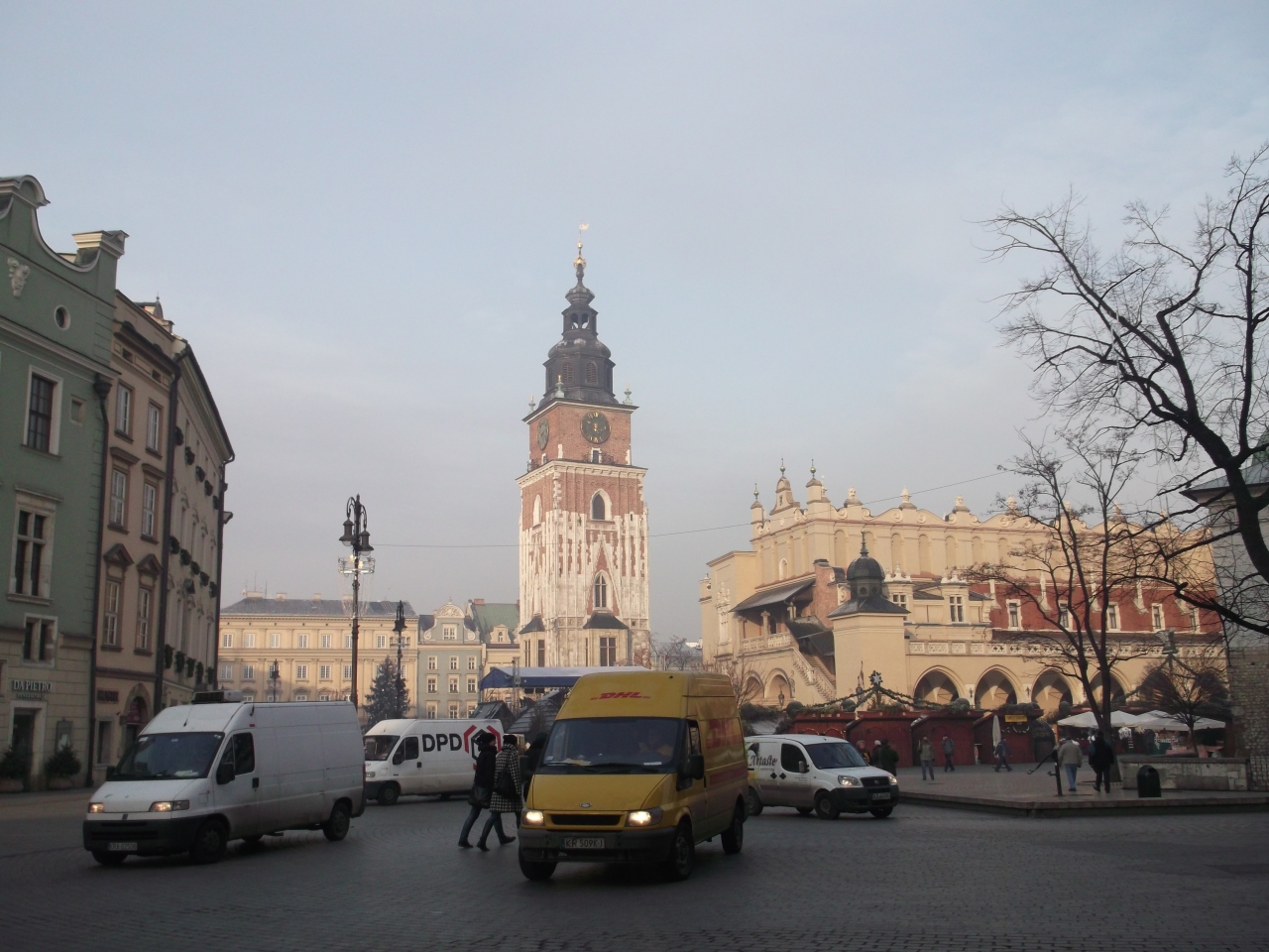 クラクフの旧市街にある中央市場広場から市庁舎を通り