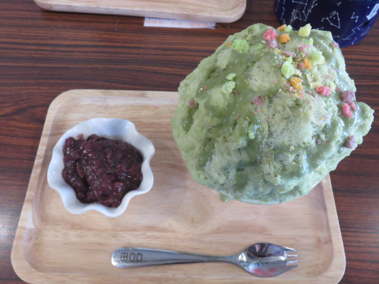 連日30度を超える猛暑の中で涼を求めて入りました。チェーン店のようでしたが、カキ氷が食べたくてチャレンジです。入り口でメニューを見ながら注文をして料金を支払い、奥のテーブル席へ移動します。注文の品が出来ると呼び出しがあり、受け取りに行きます。