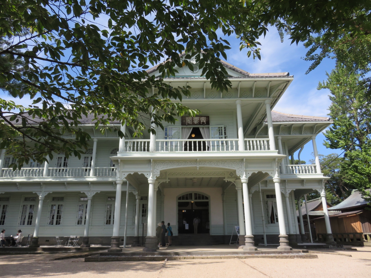 明治36年に建てられ明治45年に一部改修された建てもので、明治天皇の行在所に使用する目的でつくられたため、装飾・彫刻を多く用いた華麗な 仕上げとなっていました。