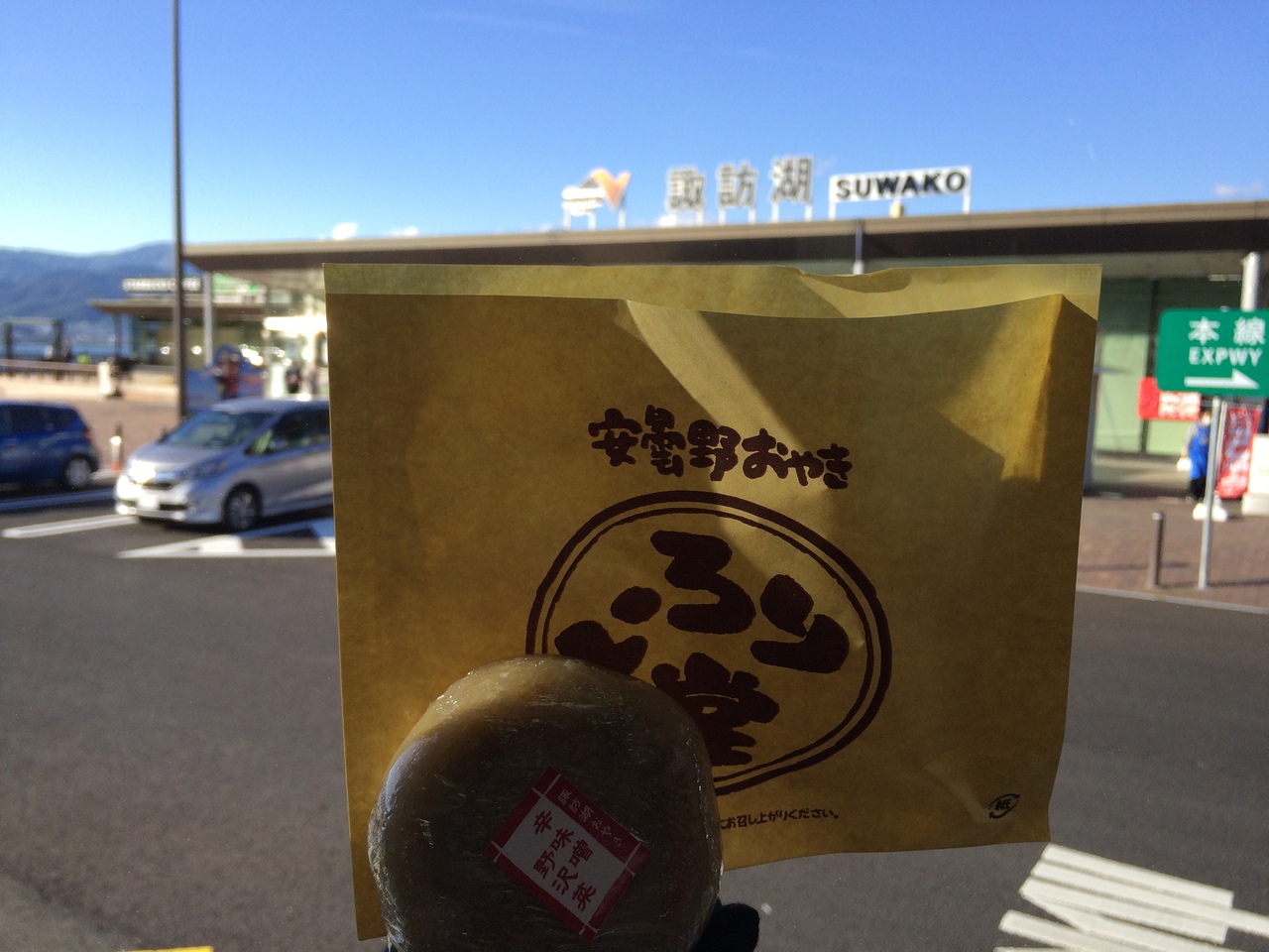 温泉施設もあり、食堂では長野のグルメが満喫出来ます。もちろんおやきも数種類あります。寒天の入った大福を試してみました。ずんだ餅寒天入りという感じです。食感がもち感アップしてます。景色も良く、諏訪湖を眺めてゆったりと過ごせます。