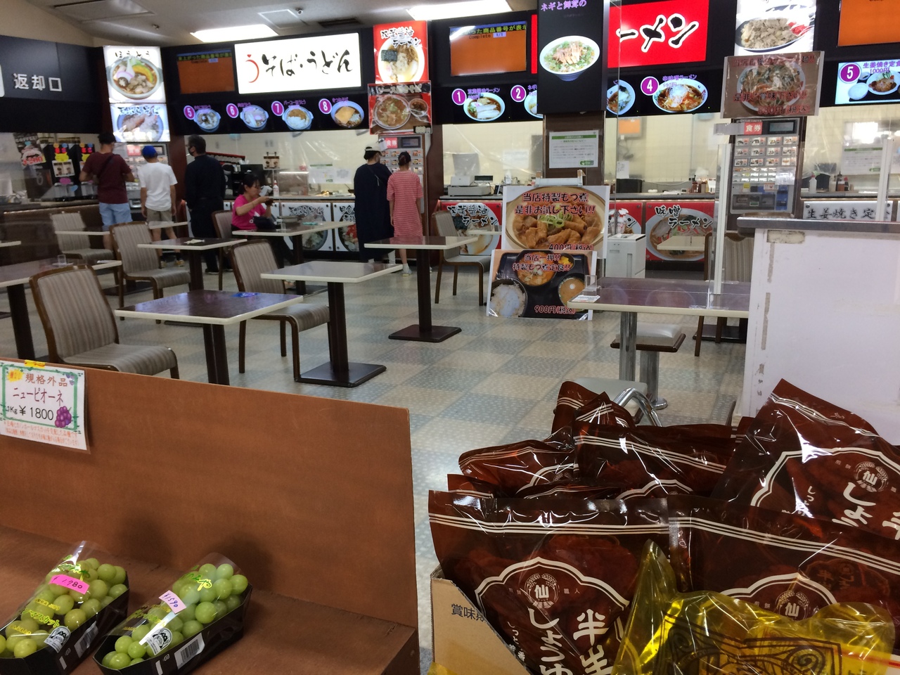 3店舗ほどの食堂がある割とこじんまりしているフードコートです。モツ煮定食とか、ほうとうとか、あったかいメニューも充実しています。時期であれば、山梨の新鮮なフルーツとか野菜も売っているので、お土産は決まりですよね!