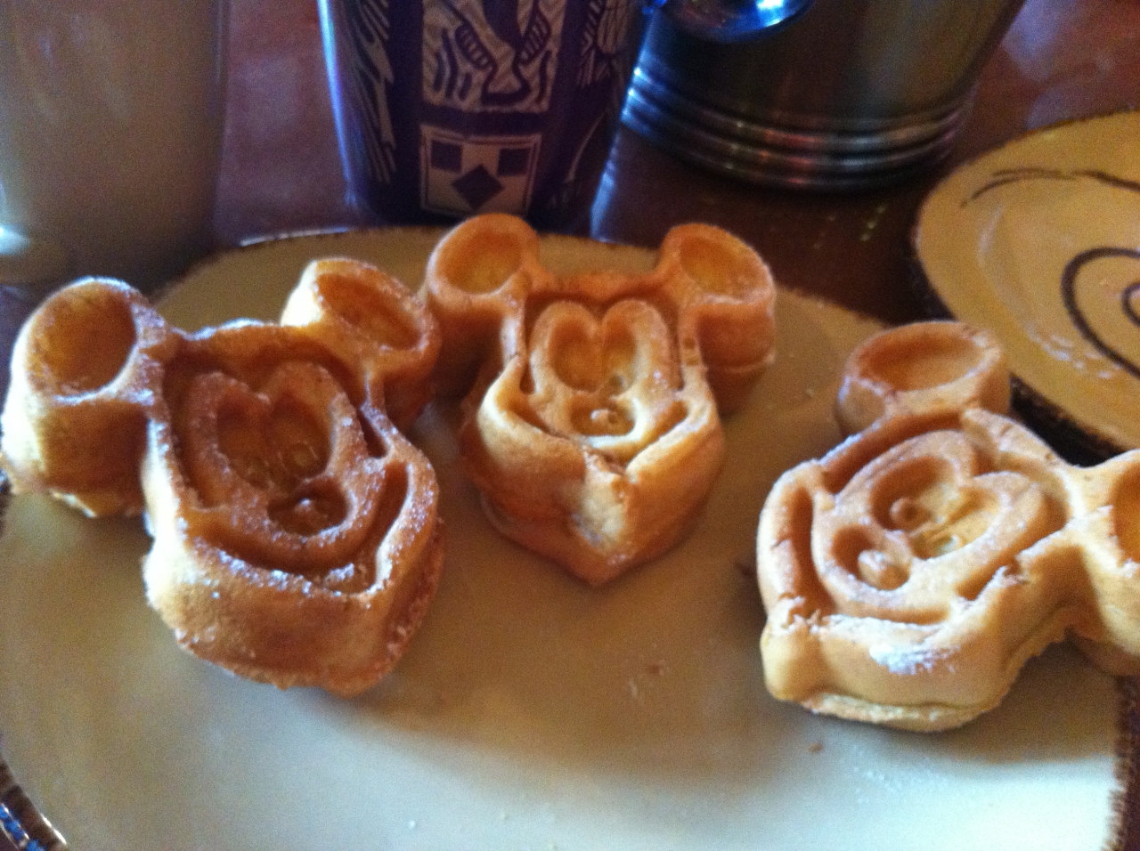 食べる前にミッキーと触れ合えるキャラクターブレックファスト。写真は自分のカメラでも沢山スタッフに写してもらえます。子供の誕生日などは、予約時に伝え忘れていても、当日その旨をテーブル担当に言えば、ケーキ持ってきてくれます。