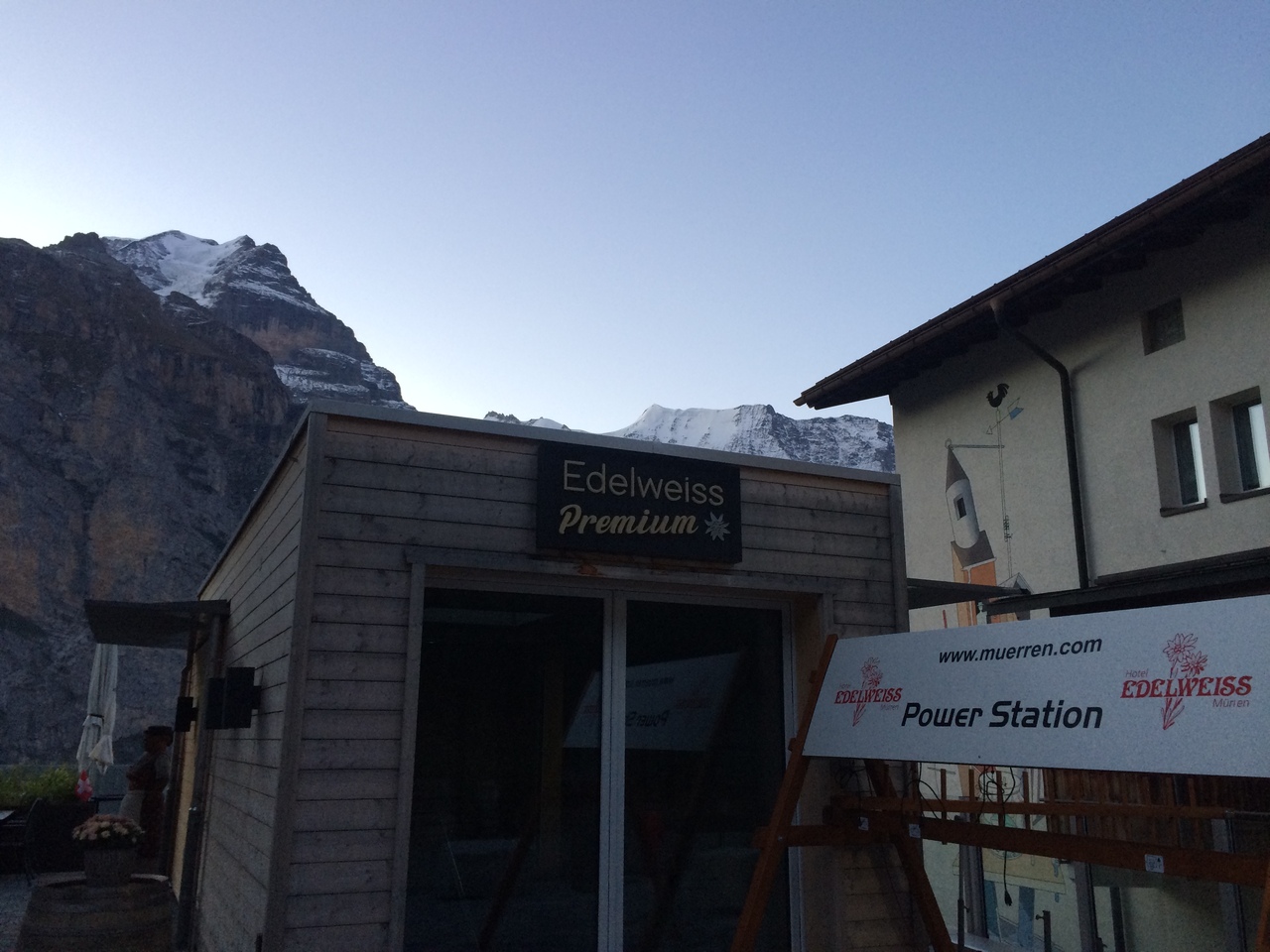 お土産屋さんやスーパーなどが並ぶ、ミューレンのメイン通りで登山電車から来る場合は、割とはじめの方に位置して便利です。レストランの雰囲気がとてもスイスらしいです。電動自転車の充電施設があるので、宿泊者以外でも覚えておくと便利なホテルです。