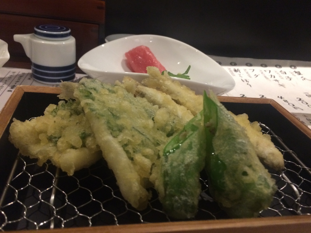 お洒落な立ち呑み天ぷらバルが、日比谷ミッドタウン内にあり、女子会に便利です。季節のお野菜の天ぷらはもちろん、面白い天ぷらが色々あって、何度行っても楽しめます。今回は、万願寺とうがらしとか、プチトマトとかをいただきました