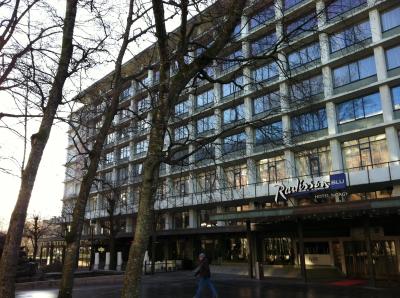ベルゲンにはラディソンが数件あります。こちらのラディソンは、空港バスも含め、市バスの停留所がすぐそばにあって、観光客だけではなく、市民が利用していました。オープンカフェもあります。広いロビーに空港バスチケットマシーンがありました。