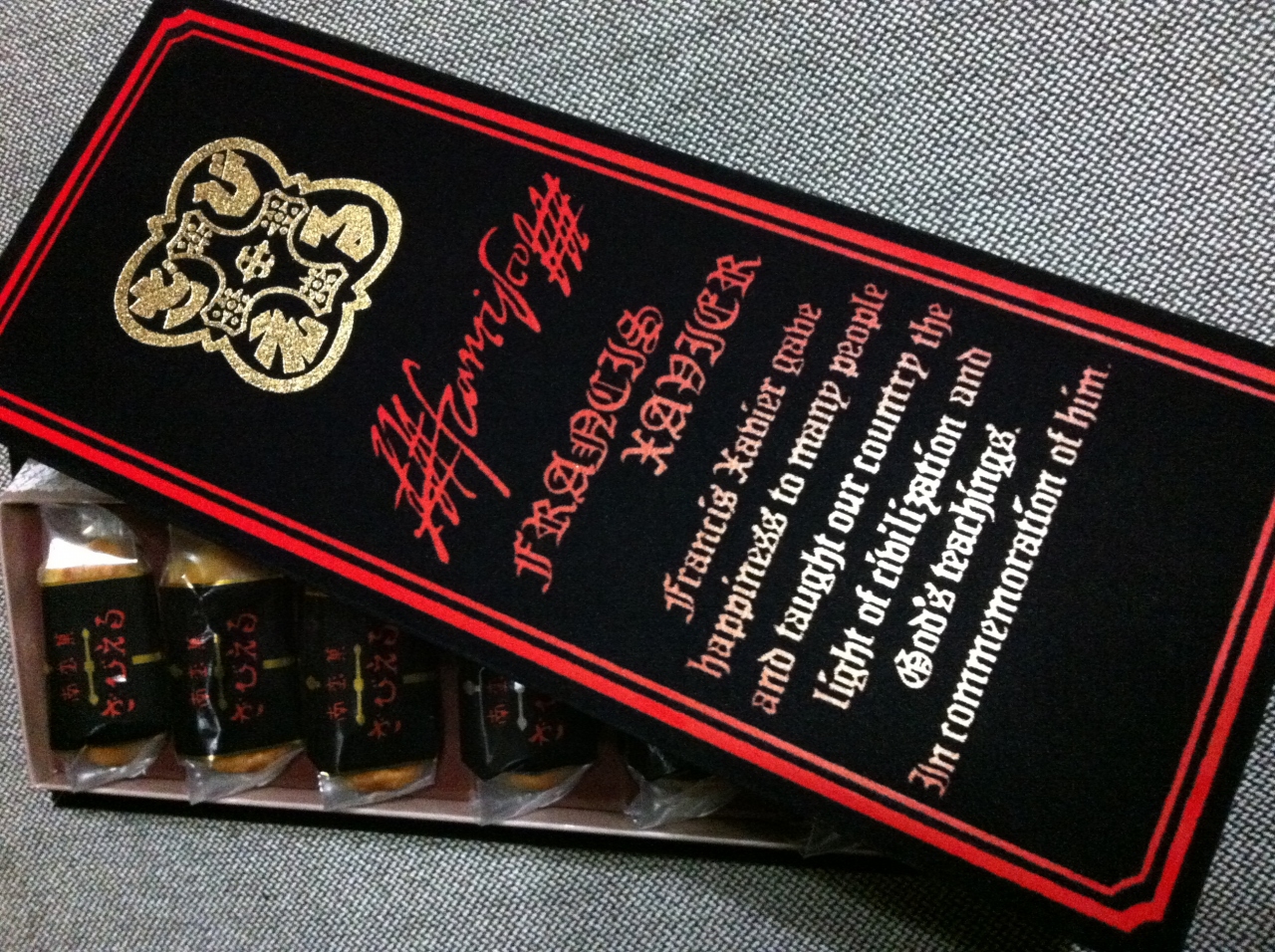 お土産の定番ザビエル。名物ですが、美味しいです(名物になんとか…といいますが)。箱がまた凝ってらっしゃるので、おつかいものにも重宝されると思われます。ほんのりお酒の風味がきいていて、ちょっと大人のお菓子です。