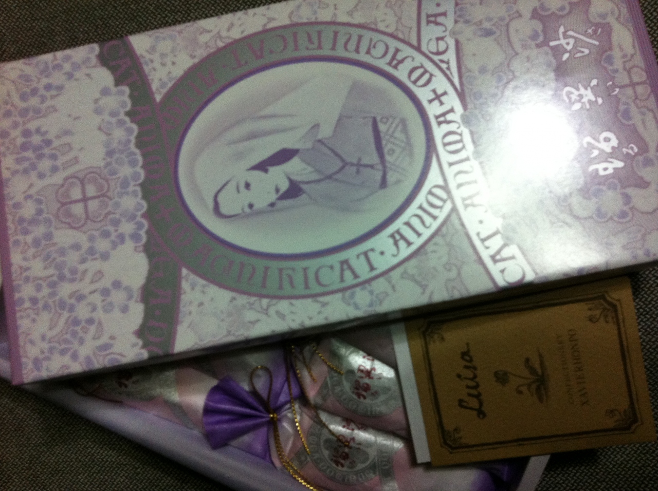 乙女のイラストが目印の「ルイサ」はすみれ風味です。あんの色がスミレ色です。このスミレ風味のお菓子は、スペインで有名です。スペインではスミレのキャンディーを購入しましたが、形もお花で、色もスミレ色、そしてかなり香料がきつい…。それに比べて、ルイサはほんのり色付けしてあるだけで、香りは強くありません。