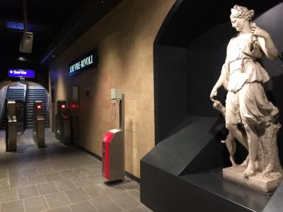 パリの地下鉄駅は、それぞれその近くの観光にちなんだデザインをしていて、見ていて楽しいし印象にも残ります。ここはさすがルーブルという感じで、彫刻が美しくディスプレイされていて、美術館行く前から気分が盛り上がってきます。