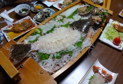 夕食に出た大きなヒラメの活け造りはぷりっぷり、残った身は朝食で煮付けで出され白いごはんが進みました。