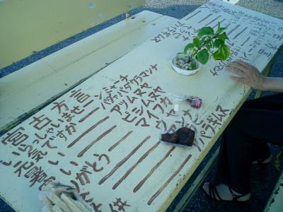 駐車場にある屋台のテーブルには沖縄の方言が書いてあります。