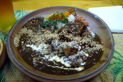 カレーはさほど辛口ではありませんが、スパイスが効いていて生クリームやゴマをふりかけていました。