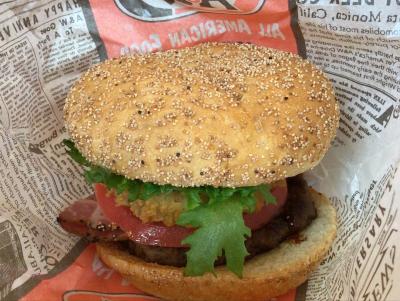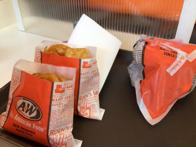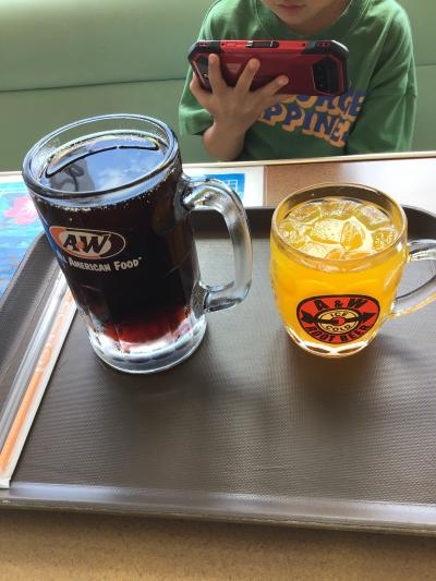 息子にはキッズチーズバーガーセット(500円)をオレンジジュースで、私はThe A&Wバーガー(740円)カーリーフライコンボ(470円)をルートビアで注文しました。