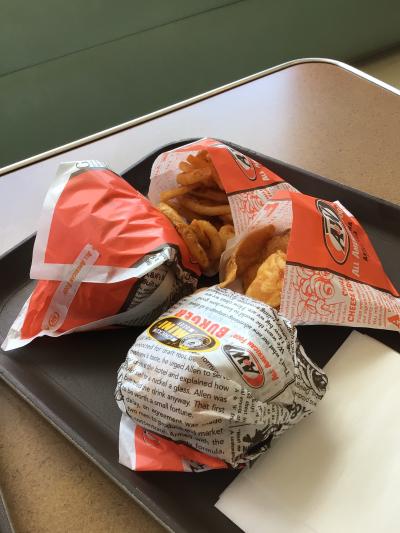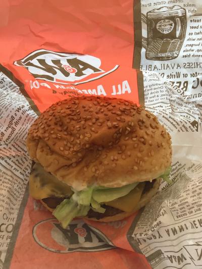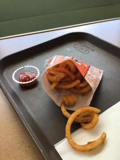 息子はキッズチーズバーガーセット、私はビッガーチーズバーガーをカーリーフライSコンボで注文しました。私の飲み物は当然ルートビアです。