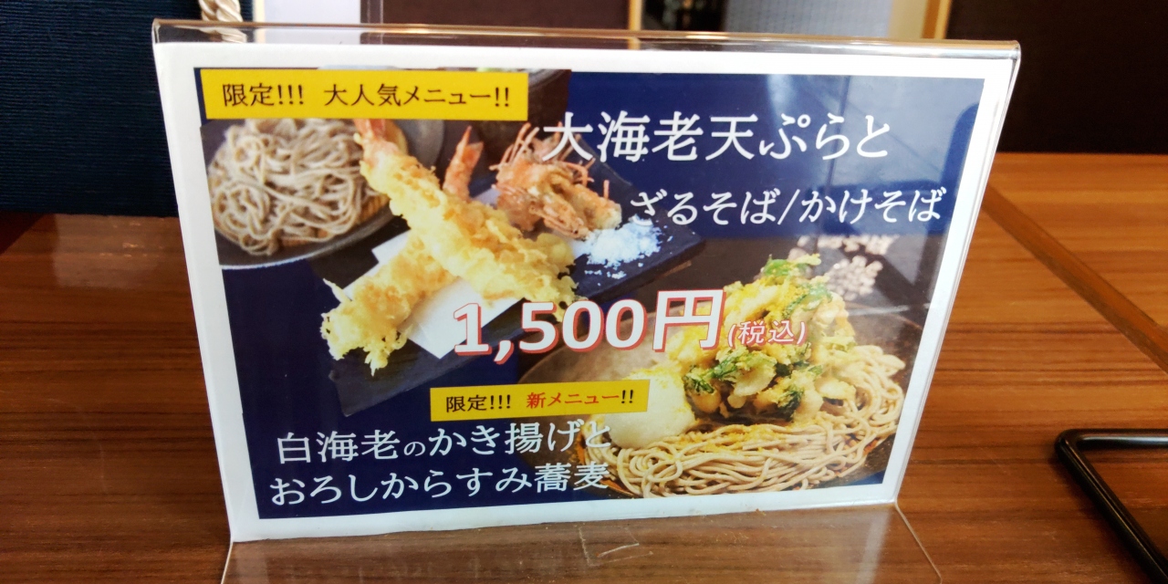 1日20食限定の大えび天ぷらざるそば(1500円)を注文しました。